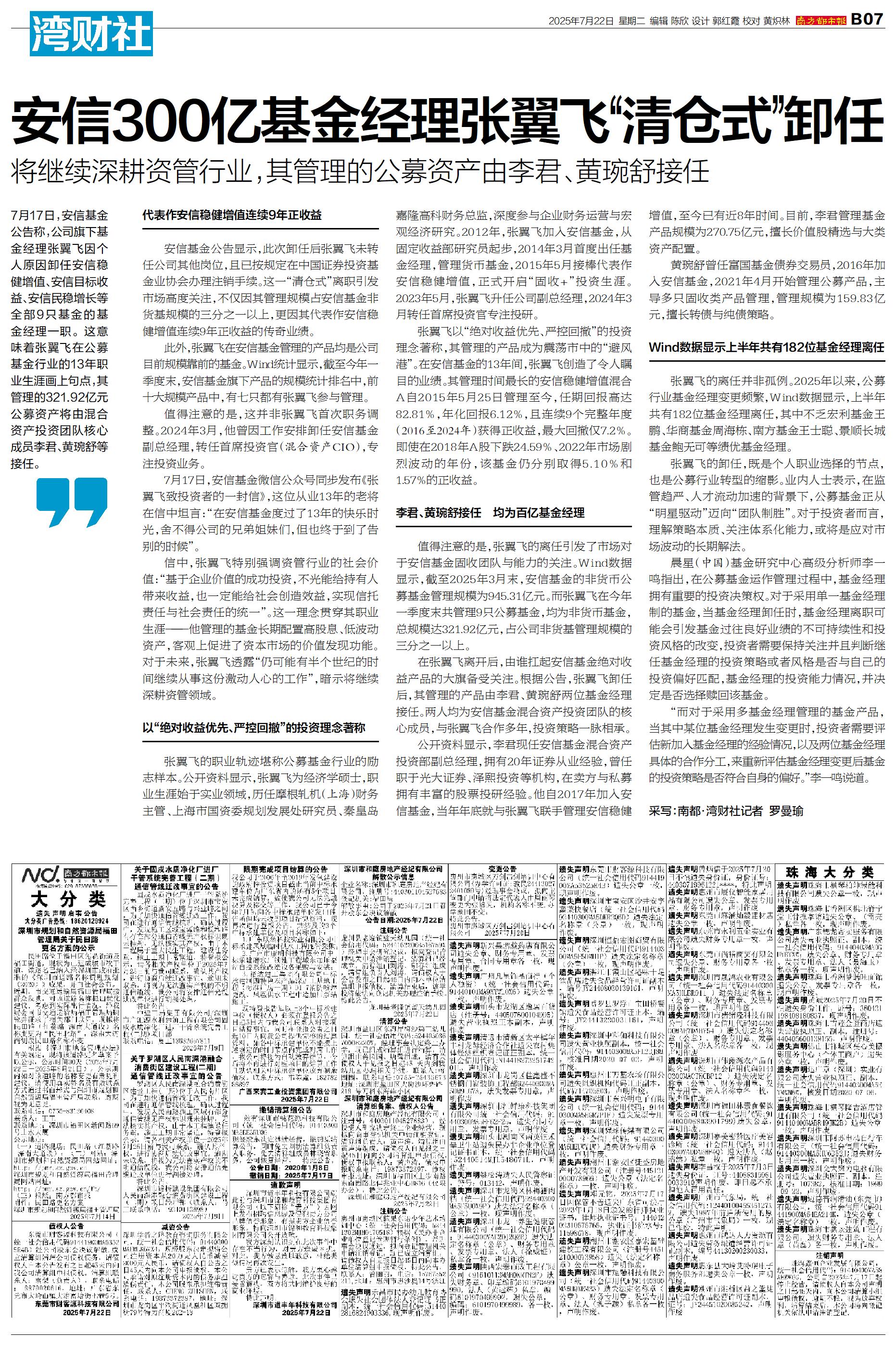 7月17日,安信基金公告称,公司旗下基金经理张翼飞因个人原因卸任安信稳健增值、安信目标收益、安信民稳增长等全部9只基金的基金经理一职。这意味着张翼飞在公募基金行业的13年职业生涯画上句点,其管理的321.92亿元公募资产将由混合资产投资团队核心成员李君、黄琬舒等接任。