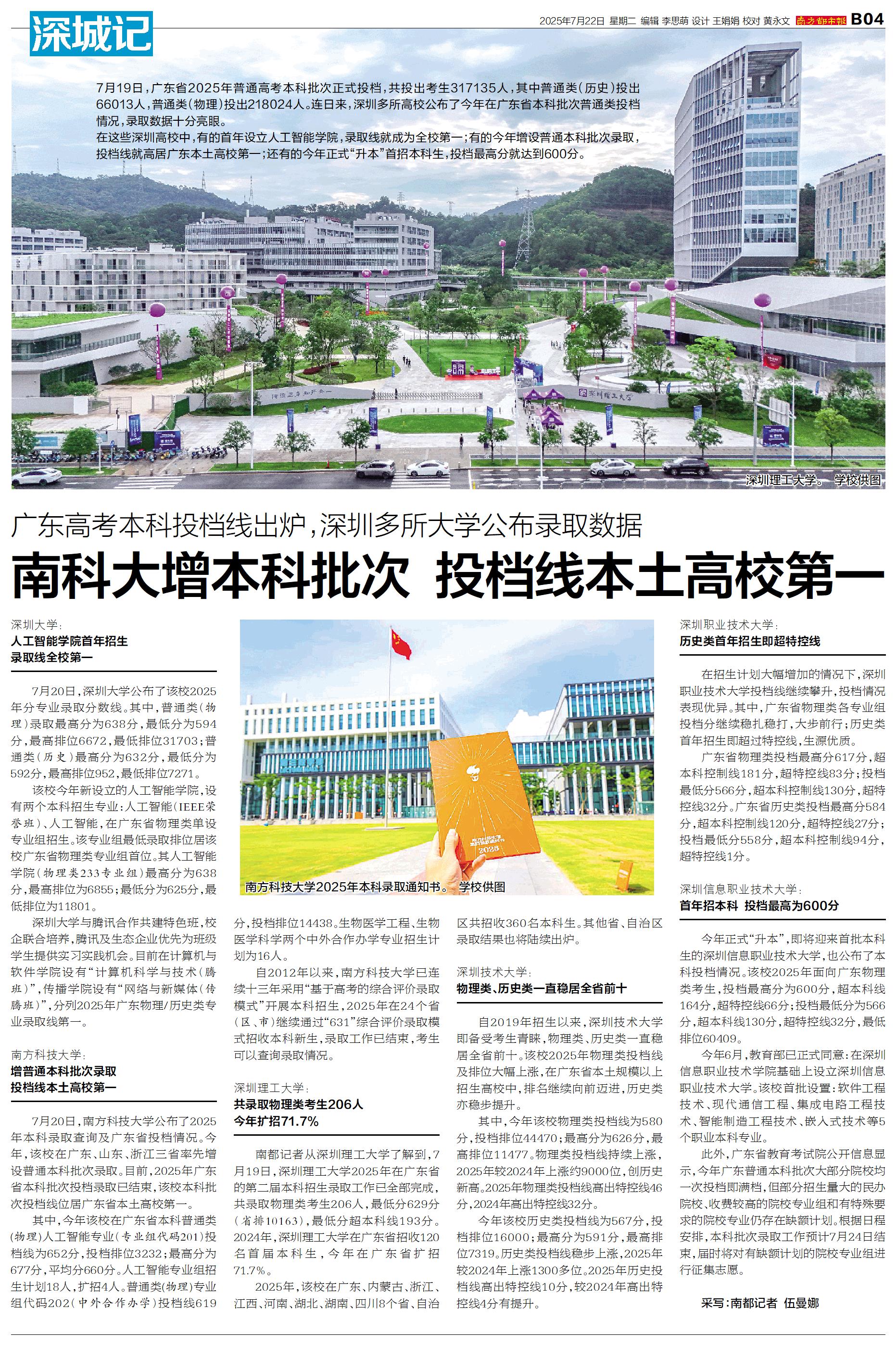 7月19日,广东省2025年普通高考本科批次正式投档,共投出考生317135人,其中普通类(历史)投出66013人,普通类(物理)投出218024人。连日来,深圳多所高校公布了今年在广东省本科批次