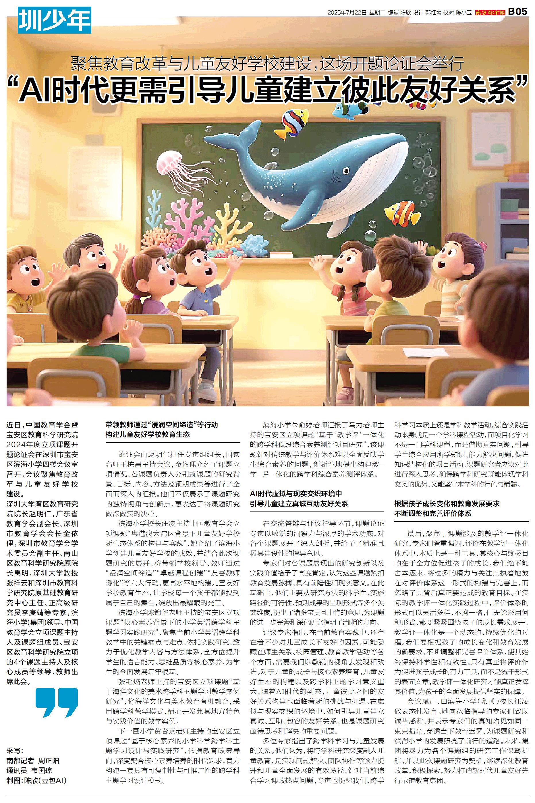 近日,中国教育学会暨宝安区教育科学研究院2024年度立项课题开题论证会在深圳市宝安区滨海小学四楼会议室召开,会议聚焦教育改革与儿童友好学校建设。 深圳大学湾区教育研究院院长赵明仁,广东省教育学会