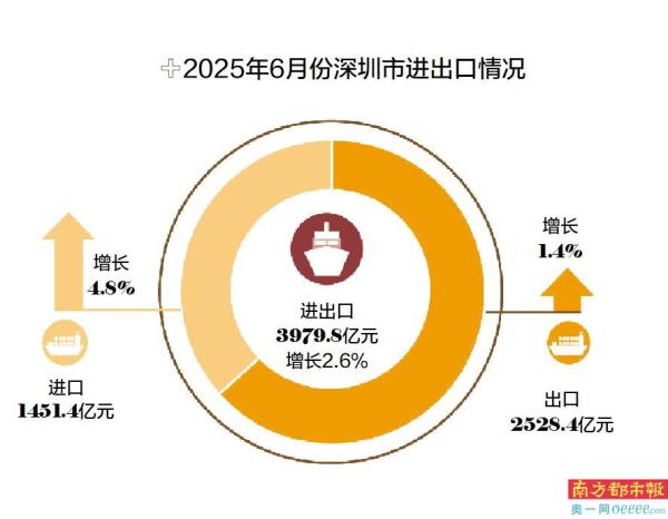 据深圳海关统计,2025年上半年,深圳市进出口2.17万亿元人民币,占同期全国进出口总值的9.9%。其中,出口1.31万亿元;进口8588.6亿元,同比(下同)增长9.5%。进出口、出口规模居内地城市首位,进口规模创历史同期新高。6月份当月,深圳市进出口3979.8亿元,增长2.6%。其中,出口2528.4亿元,增长1.4%;进口1451.4亿元,增长4.8%。