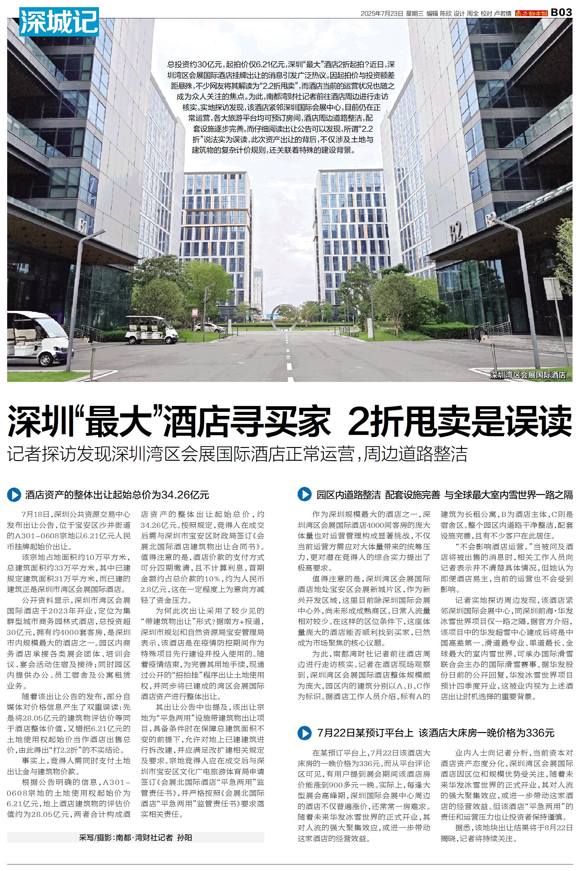 深圳“最大”酒店寻买家 2折甩卖是误读