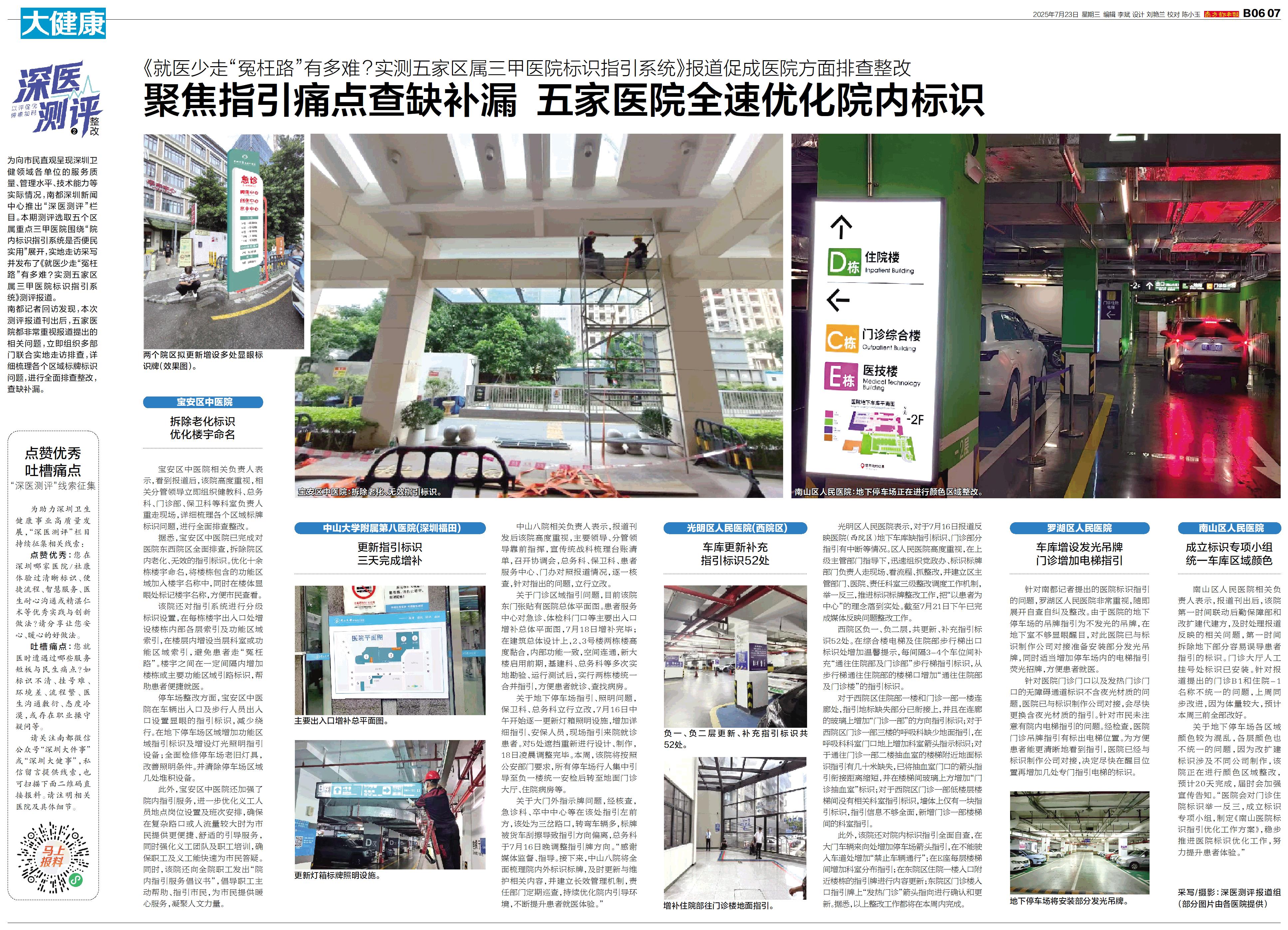 为向市民直观呈现深圳卫健领域各单位的服务质量、管理水平、技术能力等实际情况,南都深圳新闻中心推出“深医测评”栏目。本期测评选取五个区属重点三甲医院围绕“院内标识指引系统是否便民实用”展开,实地走访