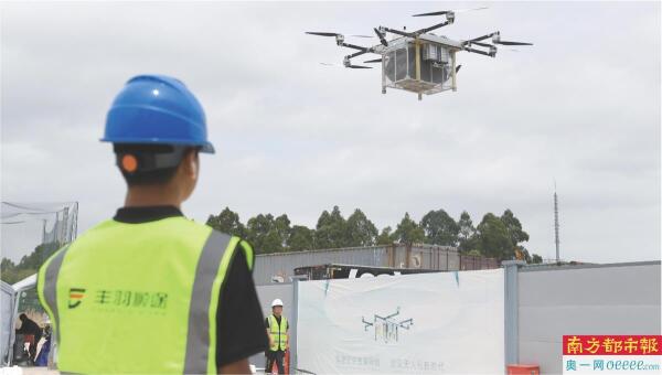 在宝安区的丰翼无人机运营中心,搭载着货物的无人机在降落。 新华社资料图