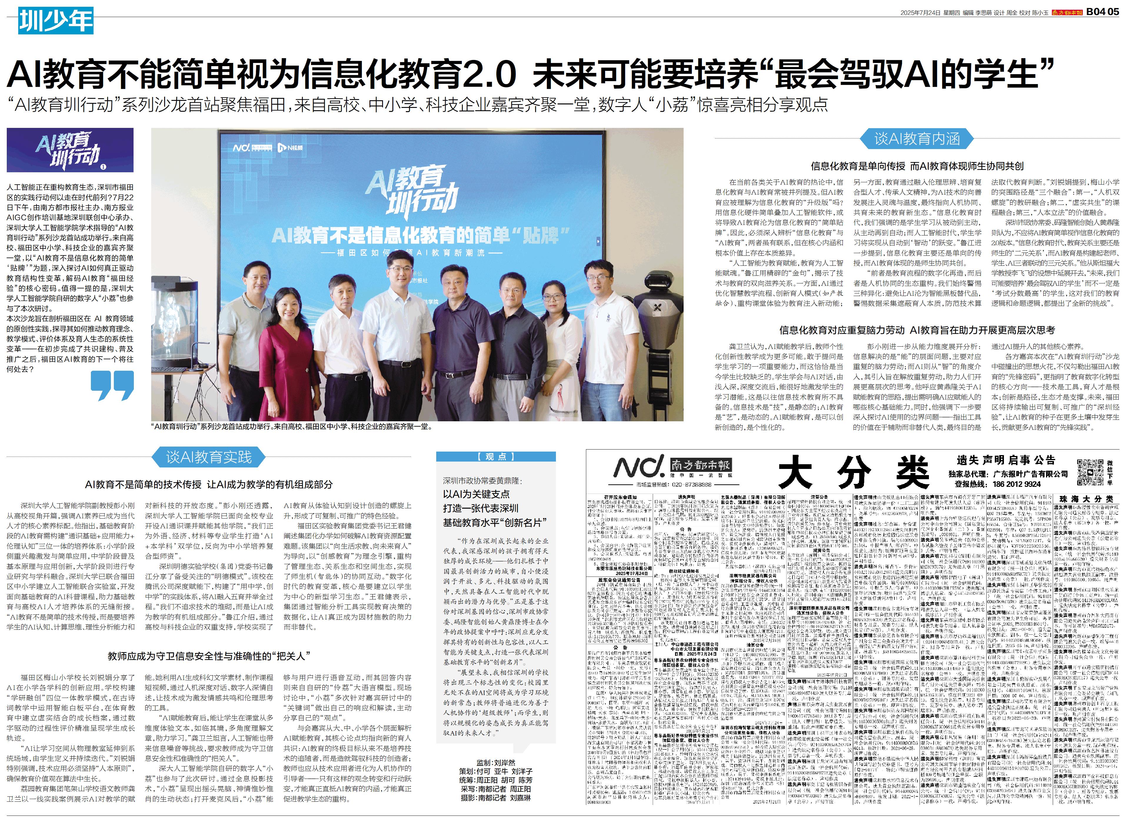 人工智能正在重构教育生态,深圳市福田区的实践行动何以走在时代前列?7月22日下午,由南方都市报社主办、南方报业AIGC创作培训基地深圳联创中心承办、深圳大学人工智能学院学术指导的“AI教育圳行动”
