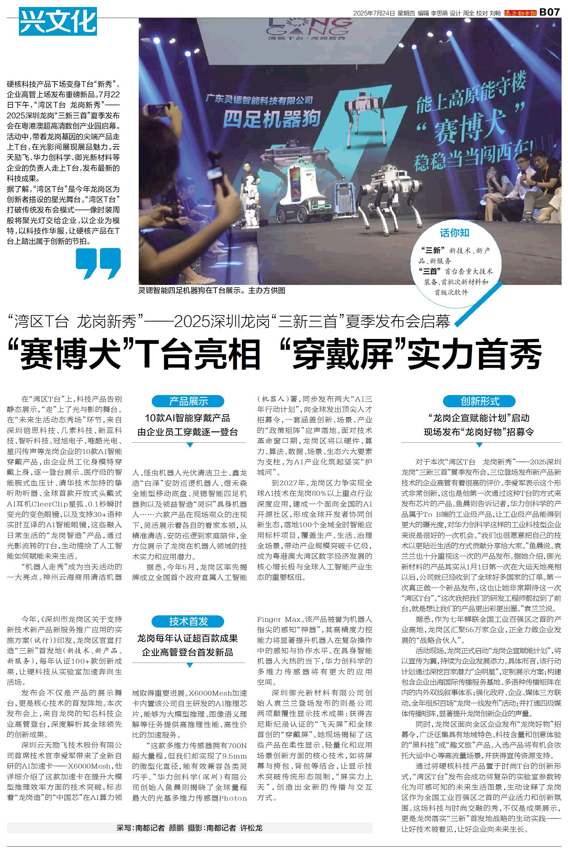 硬核科技产品下场变身T台“新秀”,企业高管上场发布重磅新品。7月22日下午,“湾区T台 龙岗新秀”——2025深圳龙岗“三新三首”夏季发布会在粤港澳超高清数创产业园启幕。活动中,带着龙岗基因的尖端