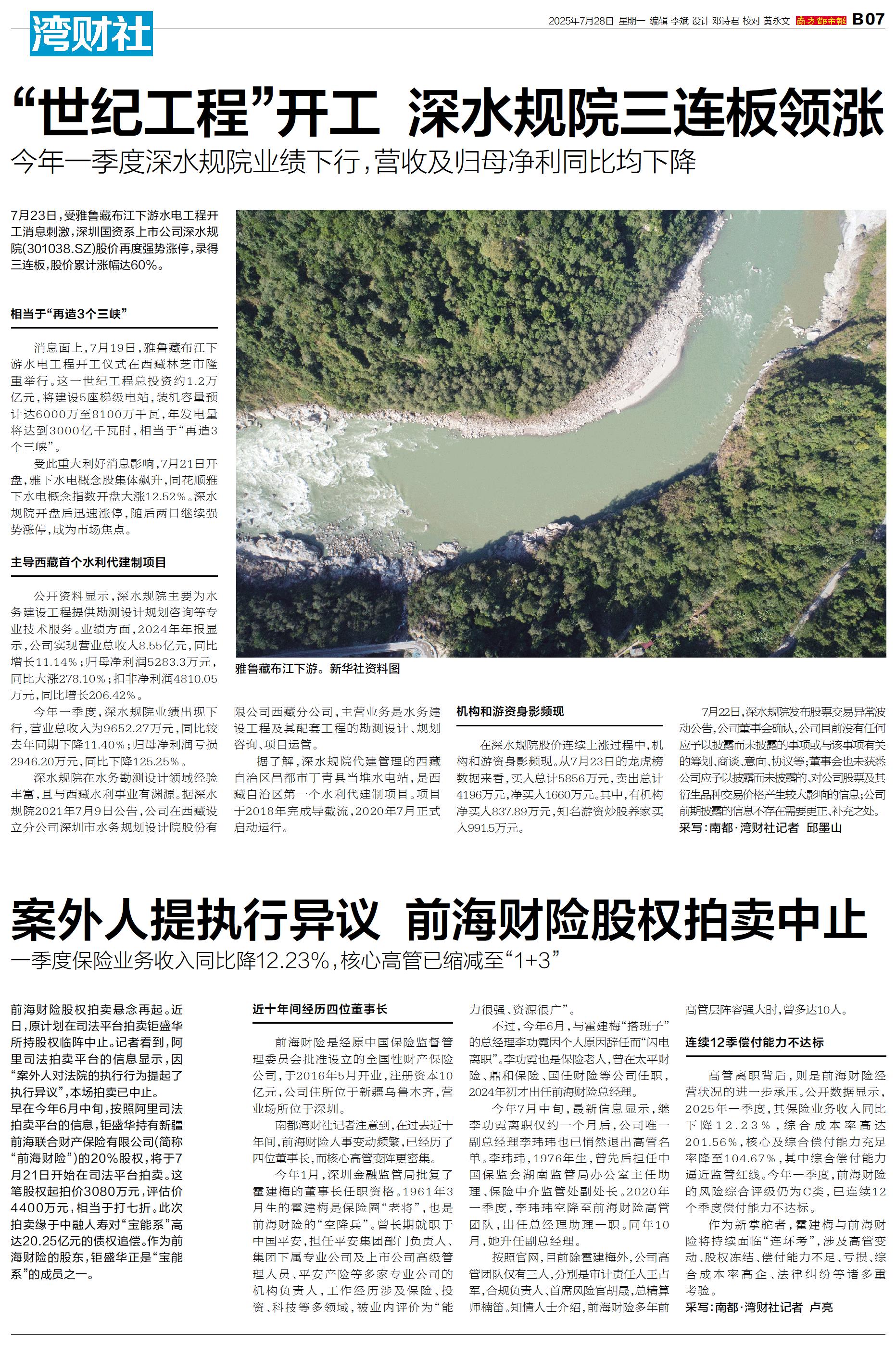 7月23日,受雅鲁藏布江下游水电工程开工消息刺激,深圳国资系上市公司深水规院(301038.SZ)股价再度强势涨停,录得三连板,股价累计涨幅达60%。