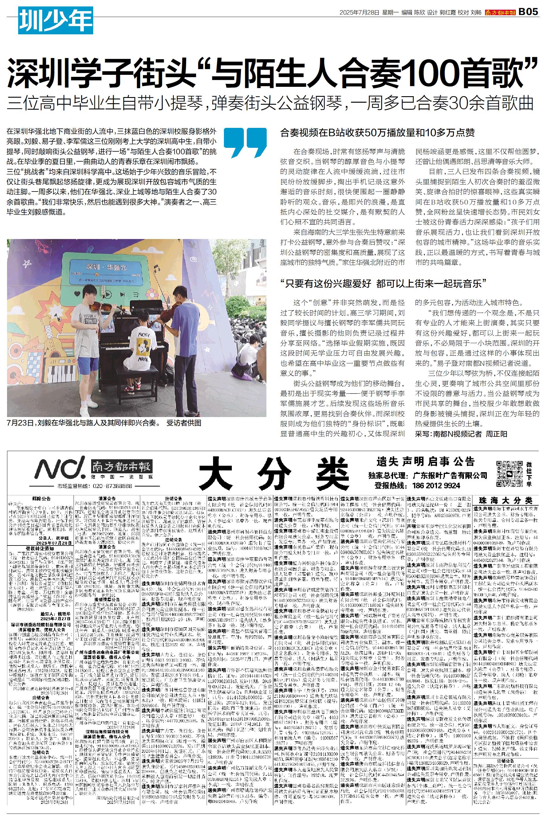 在深圳华强北地下商业街的人流中,三抹蓝白色的深圳校服身影格外亮眼。刘毅、易子登、李军儒这三位刚刚考上大学的深圳高中生,自带小提琴,同时敲响街头公益钢琴,进行一场“与陌生人合奏100首歌”的挑战。在