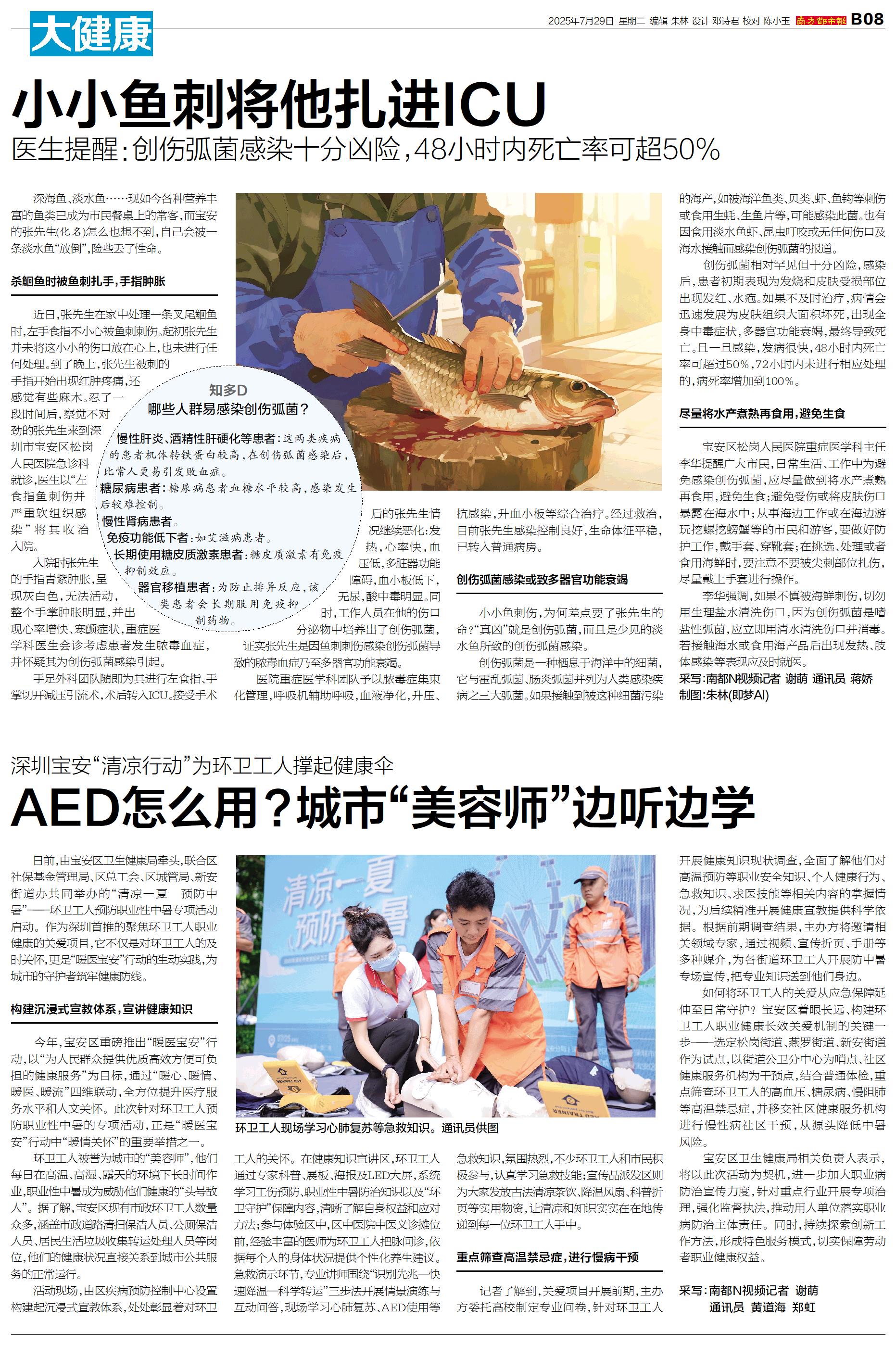 宝安区松岗人民医院重症医学科主任李华提醒广大市民,日常生活、工作中为避免感染创伤弧菌,应尽量做到将水产煮熟再食用,避免生食;避免受伤或将皮肤伤口暴露在海水中;从事海边工作或在海边游玩挖螺挖螃蟹等的市民和游客,要做好防护工作,戴手套、穿靴套;在挑选、处理或者食用海鲜时,要注意不要被尖刺部位扎伤,尽量戴上手套进行操作。