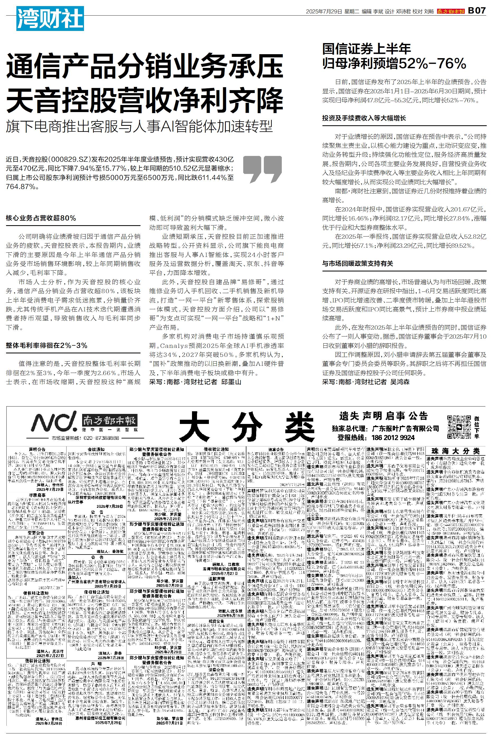 近日,天音控股(000829.SZ)发布2025年半年度业绩预告,预计实现营收430亿元至470亿元,同比下降7.94%至15.77%,较上年同期的510.52亿元显著缩水;归属上市公司股东净利润