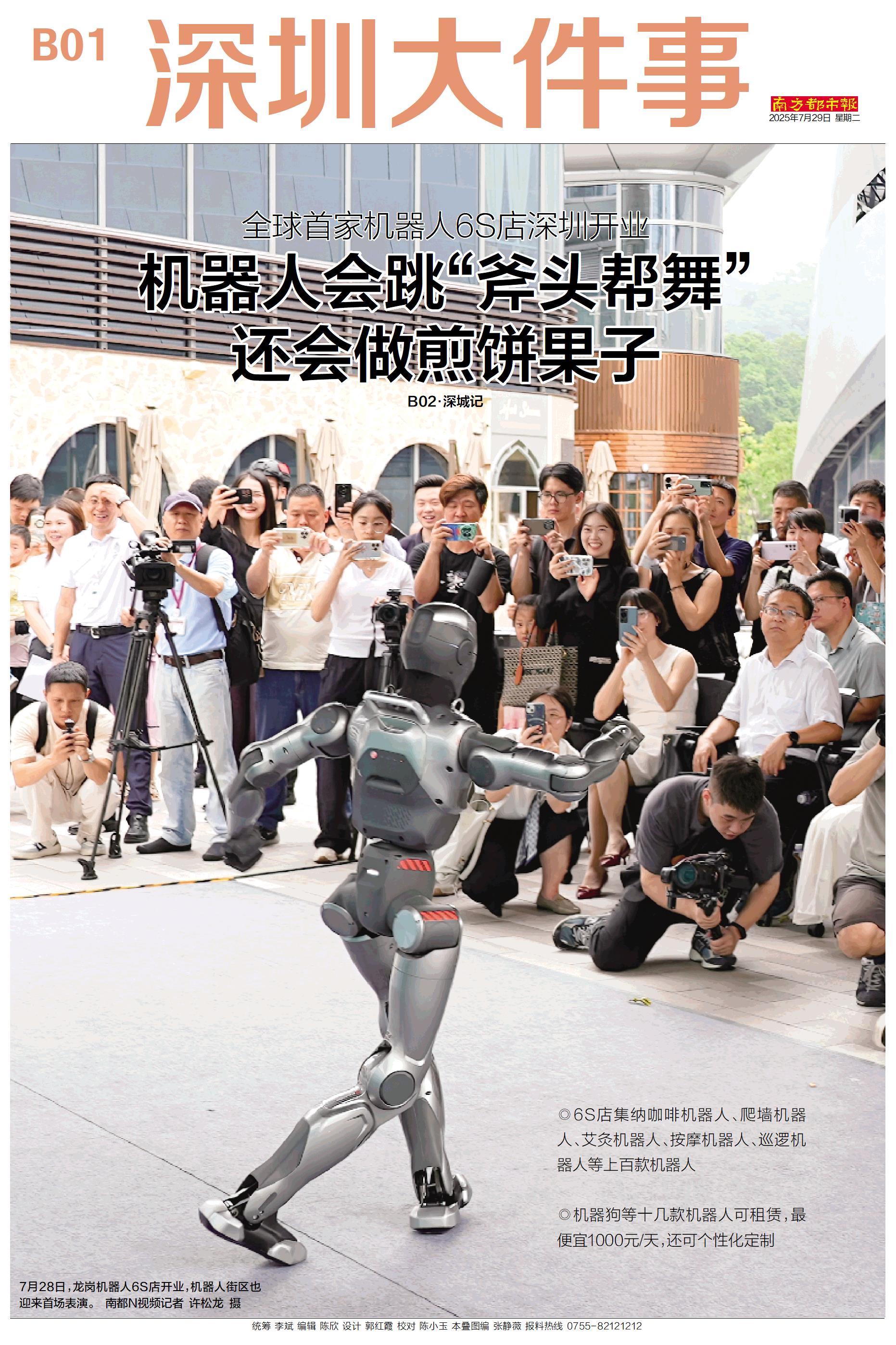 ◎6S店集纳咖啡机器人、爬墙机器人、艾灸机器人、按摩机器人、巡逻机器人等上百款机器人 ◎机器狗等十几款机器人可租赁,最便宜1000元/天,还可个性化定制 B02·深城记