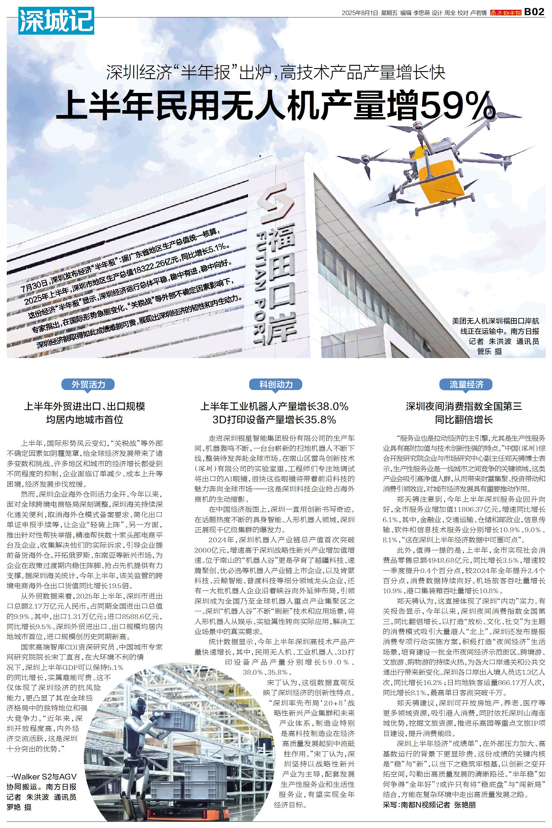 统计数据显示,今年上半年深圳高技术产品产量快速增长,其中,民用无人机、工业机器人、3D打印设备产品产量分别增长59.0%、38.0%、35.8%。