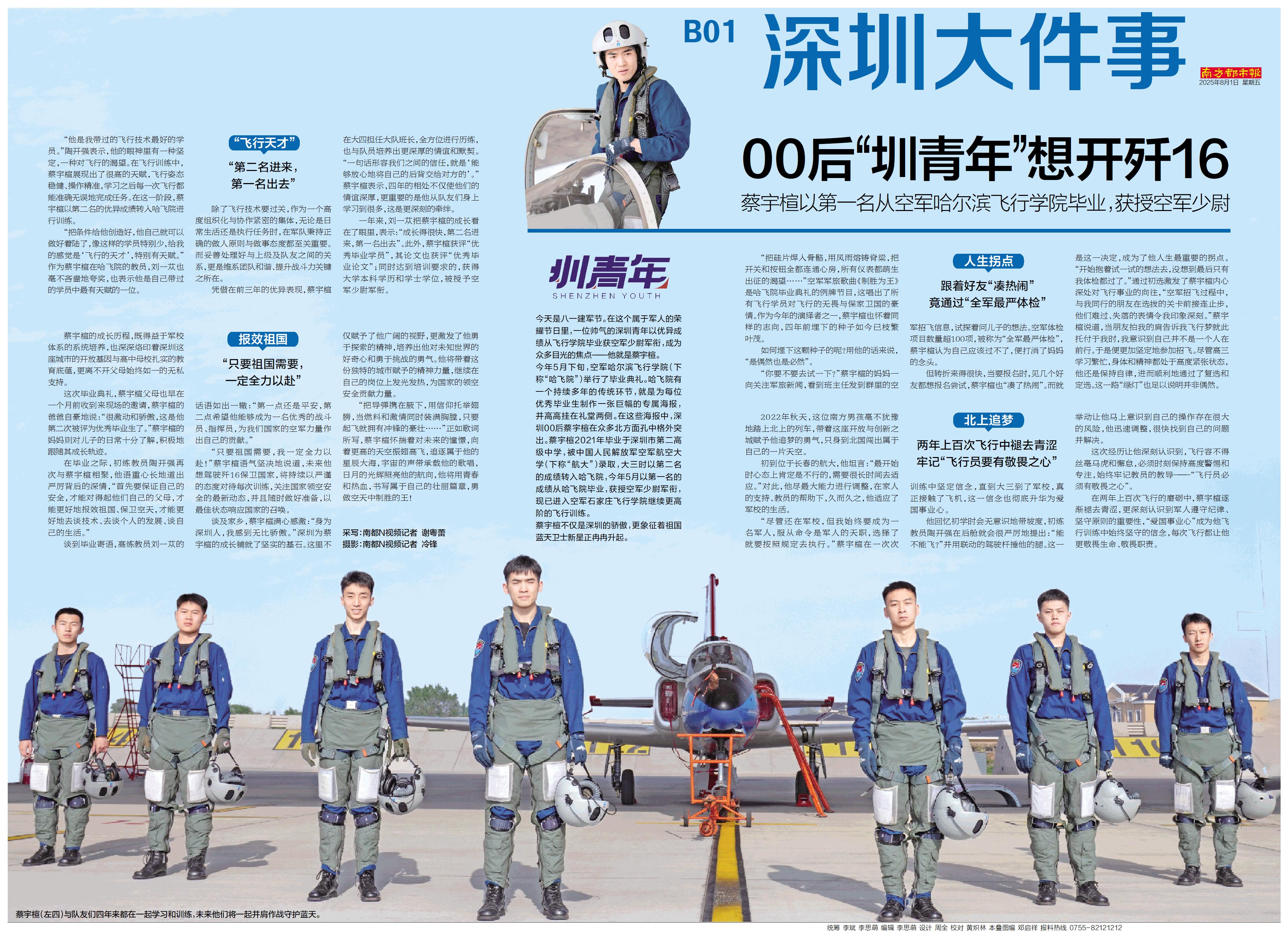谈及家乡,蔡宇楦满心感激:“身为深圳人,我感到无比骄傲。”深圳为蔡宇楦的成长铺就了坚实的基石。这里不仅赋予了他广阔的视野,更激发了他勇于探索的精神,培养出他对未知世界的好奇心和勇于挑战的勇气。他将带着这份独特的城市赋予的精神力量,继续在自己的岗位上发光发热,为国家的领空安全贡献力量。