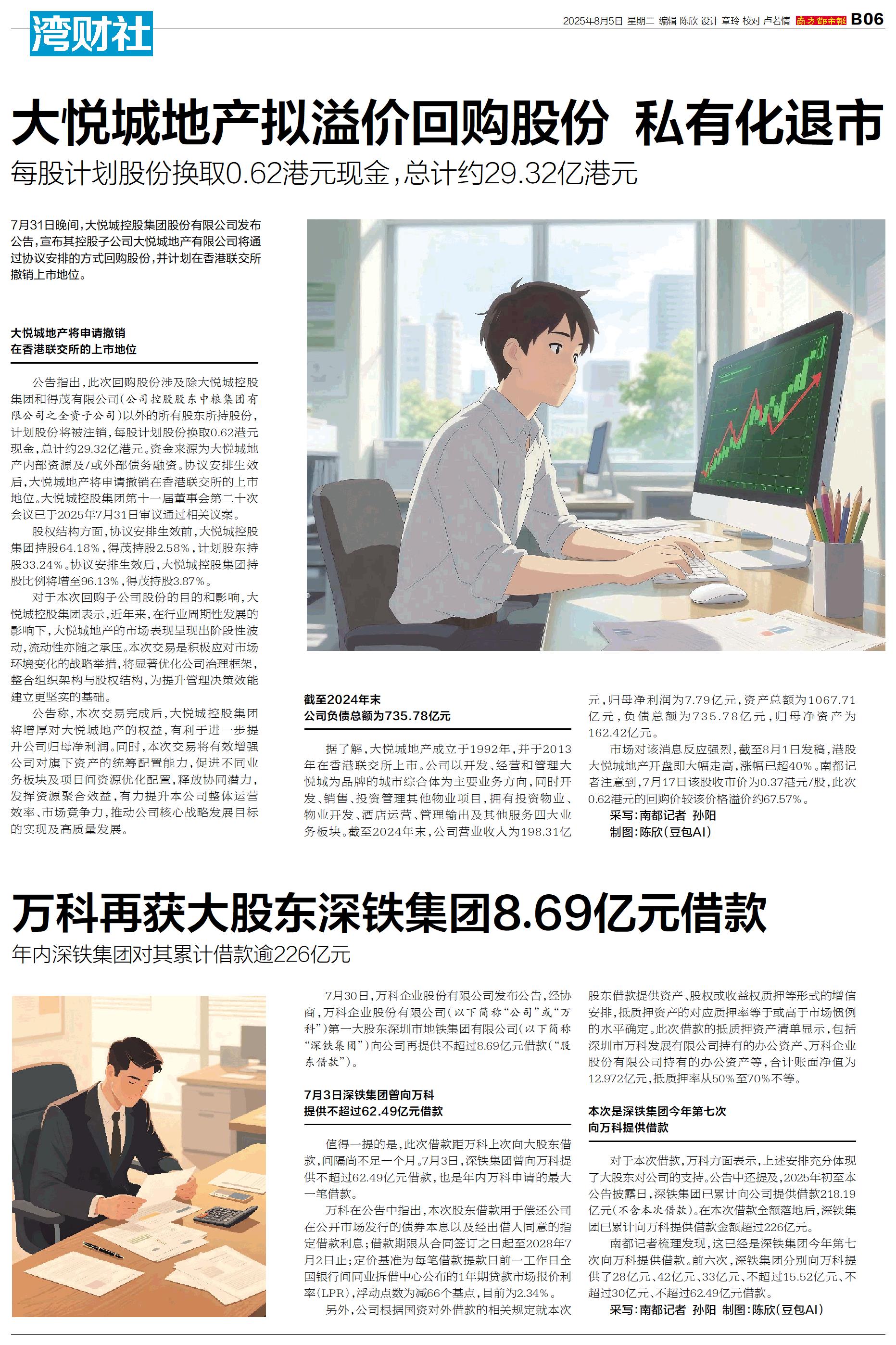 7月30日,万科企业股份有限公司发布公告,经协商,万科企业股份有限公司(以下简称“公司”或“万科”)第一大股东深圳市地铁集团有限公司(以下简称“深铁集团”)向公司再提供不超过8.69亿元借款(“股