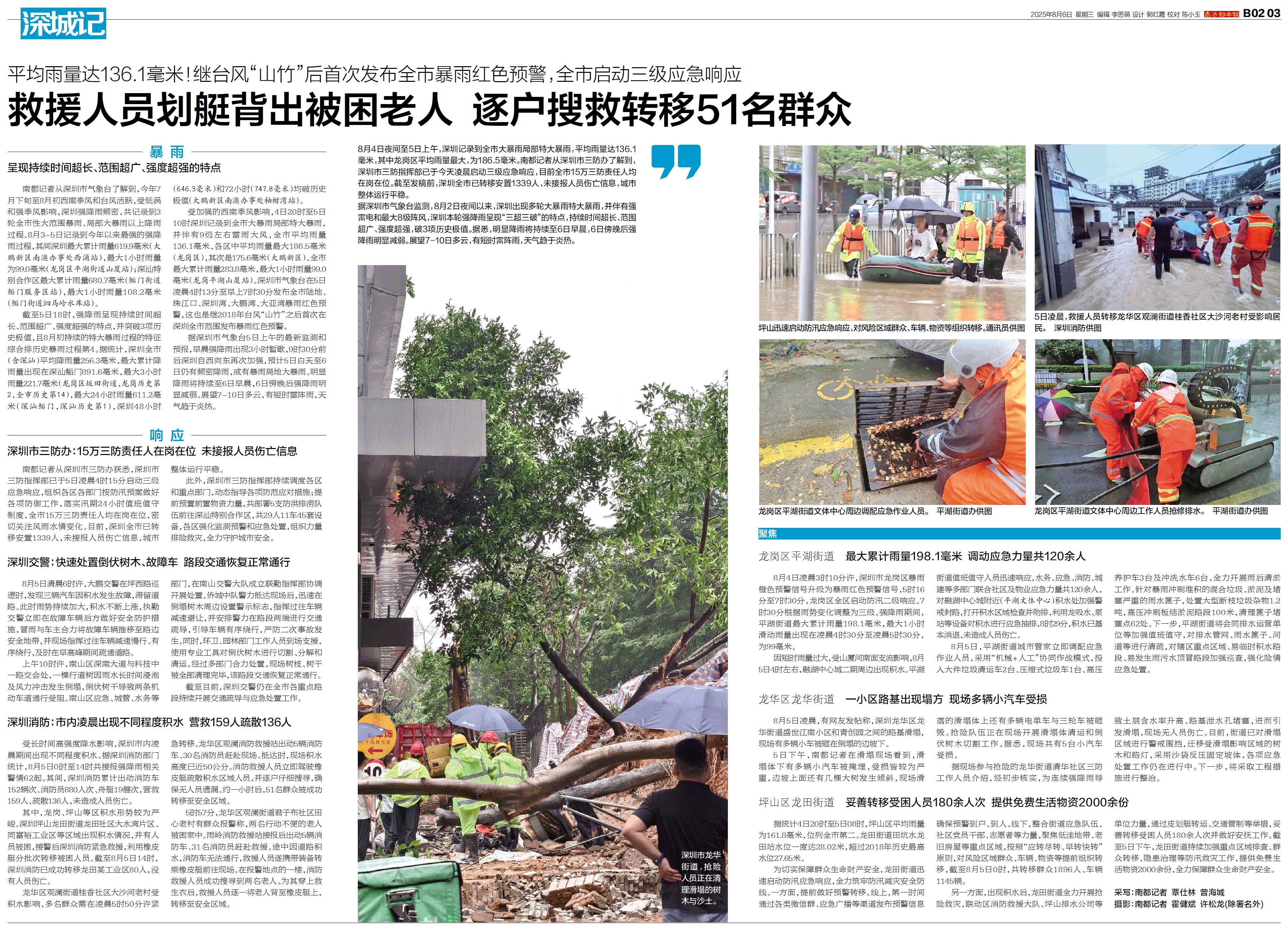 8月4日夜间至5日上午,深圳记录到全市大暴雨局部特大暴雨,平均雨量达136.1毫米,其中龙岗区平均雨量最大,为186.5毫米。南都记者从深圳市三防办了解到,深圳市三防指挥部已于今天凌晨启动三级应急