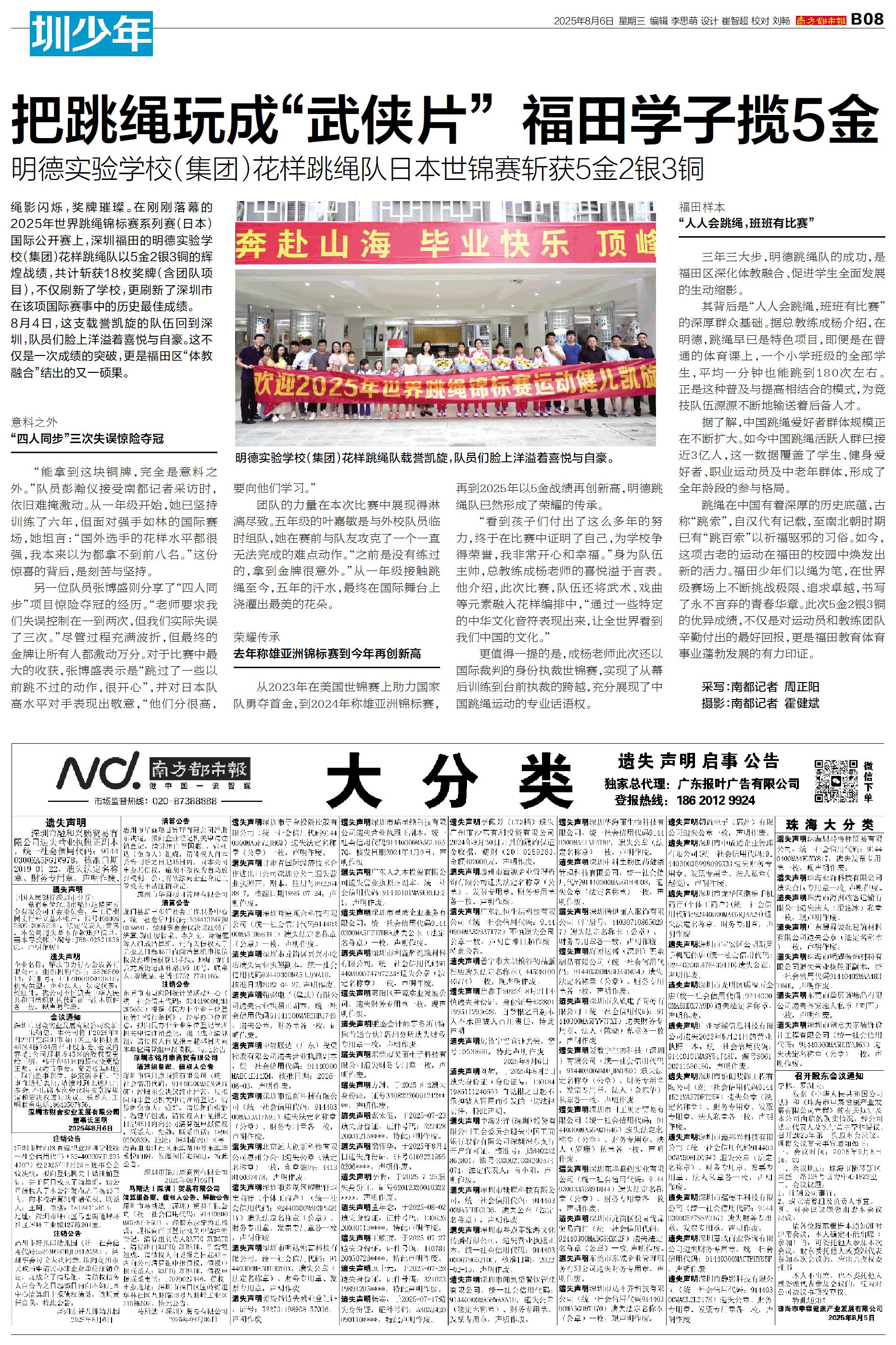 绳影闪烁,奖牌璀璨。在刚刚落幕的2025年世界跳绳锦标赛系列赛(日本)国际公开赛上,深圳福田的明德实验学校(集团)花样跳绳队以5金2银3铜的辉煌战绩,共计斩获18枚奖牌(含团队项目),不仅刷新了学
