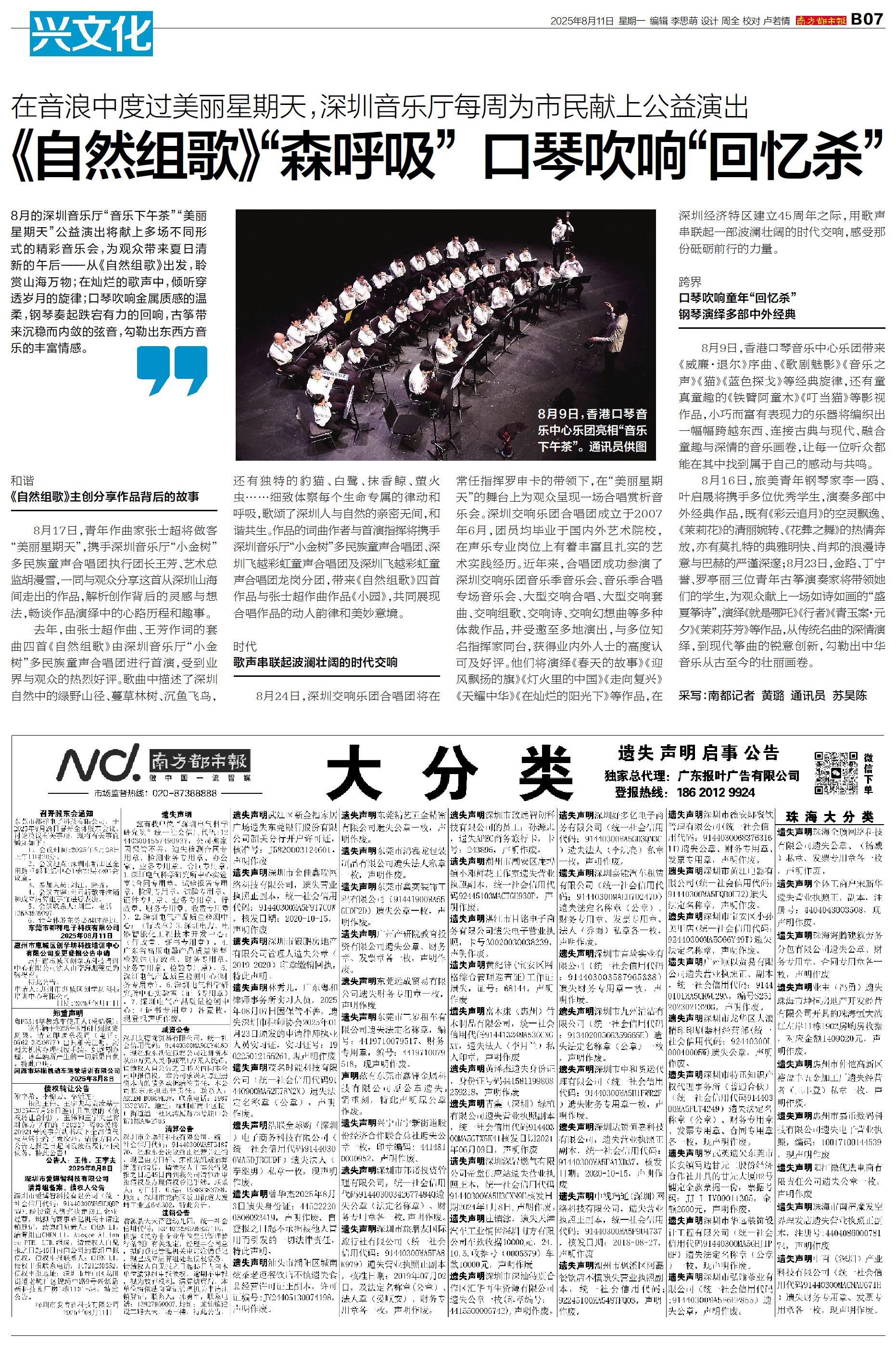 8月的深圳音乐厅“音乐下午茶”“美丽星期天”公益演出将献上多场不同形式的精彩音乐会,为观众带来夏日清新的午后——从《自然组歌》出发,聆赏山海万物;在灿烂的歌声中,倾听穿透岁月的旋律;口琴吹响金属质