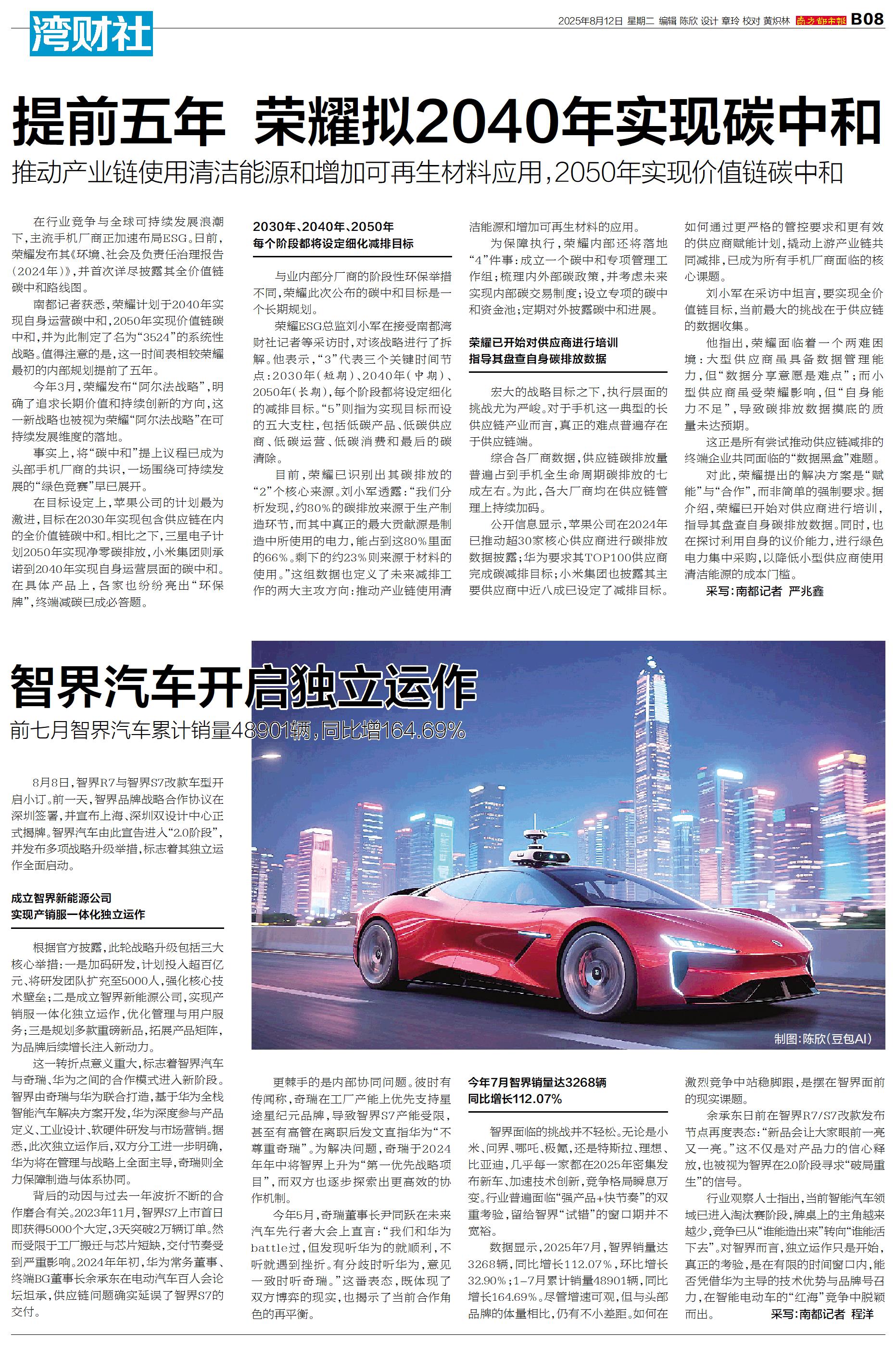 8月8日,智界R7与智界S7改款车型开启小订。前一天,智界品牌战略合作协议在深圳签署,并宣布上海、深圳双设计中心正式揭牌。智界汽车由此宣告进入“2.0阶段”,并发布多项战略升级举措,标志着其独立运作全面启动。