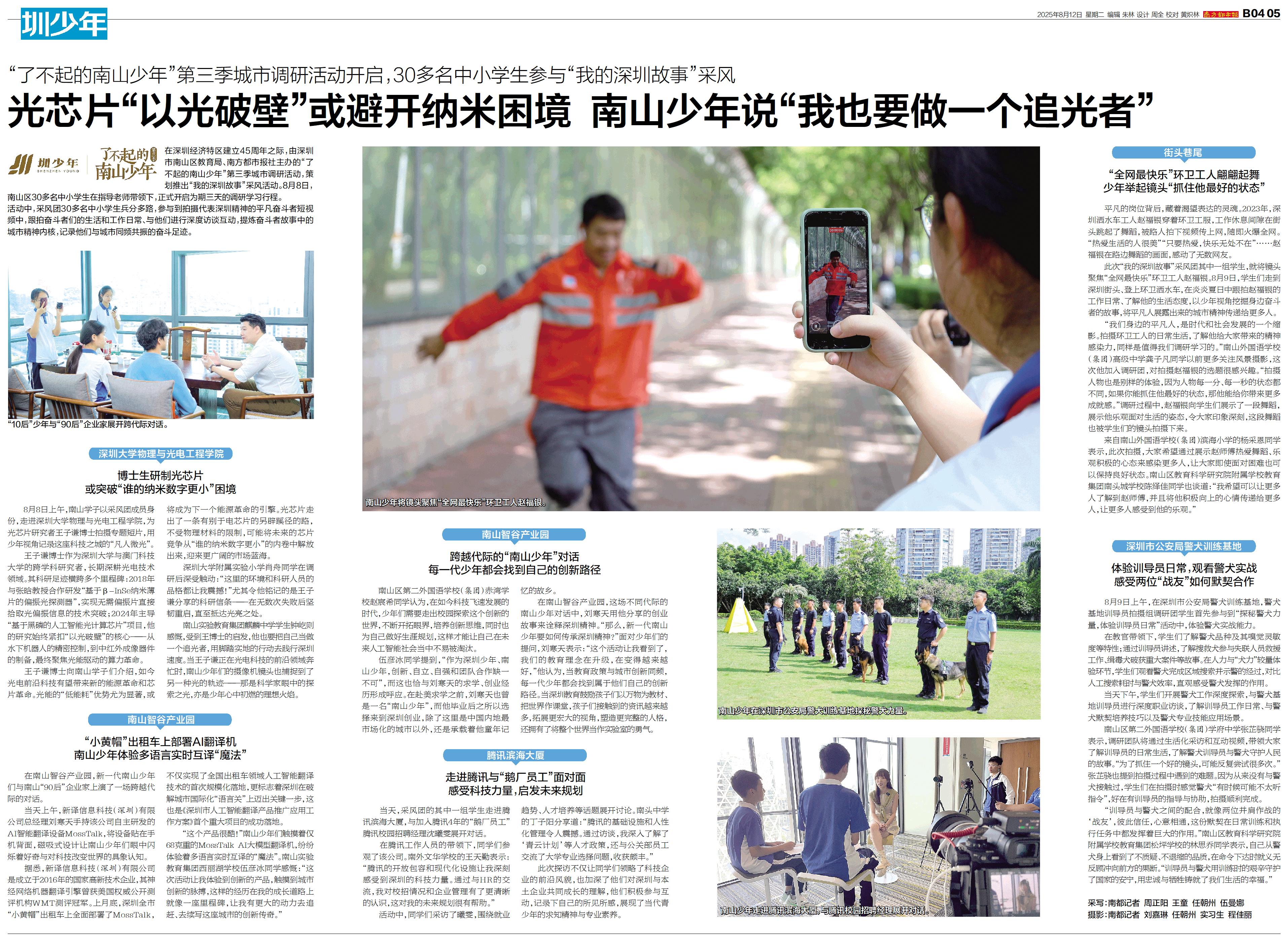 在深圳经济特区建立45周年之际,由深圳市南山区教育局、南方都市报社主办的“了不起的南山少年”第三季城市调研活动,策划推出“我的深圳故事”采风活动。8月8日,南山区30多名中小学生在指导老师带领下,