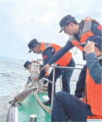 近日,深圳海警局执法员在执行日常海域巡逻任务时,在波光粼粼的海面上发现了一处漂浮的白色异物,驶近细看,一只海龟被破旧的渔网紧紧缠绕,口鼻处也被渔线勒住,呼吸艰难,情况十分危急。执法员见状,立即展开