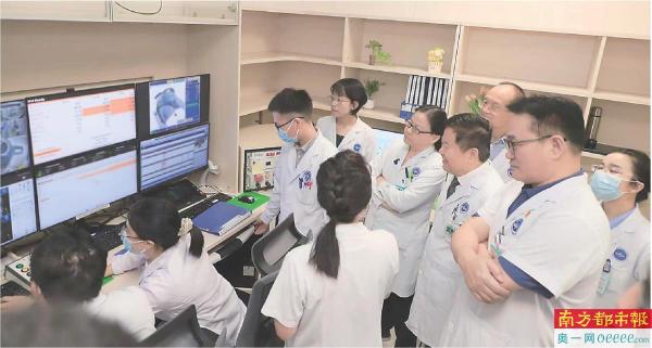 中国医学科学院肿瘤医院深圳医院院长王绿化、副院长昌盛、质子放疗中心主任金晶等在质子治疗室实时观察张姐治疗情况。 受访单位供图