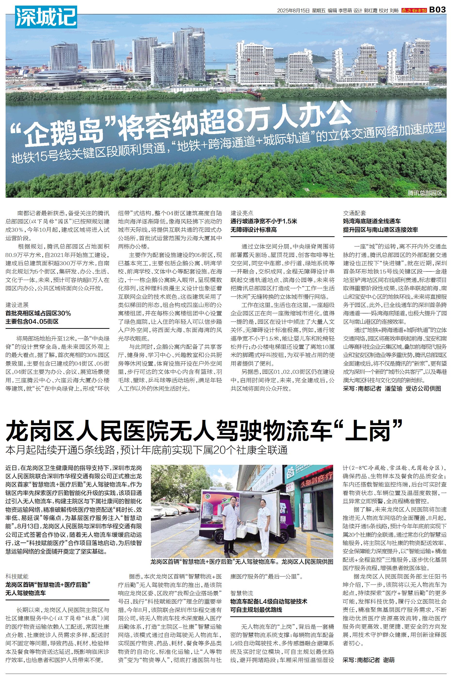 近日,在龙岗区卫生健康局的指导支持下,深圳市龙岗区人民医院联合深圳市华程交通有限公司正式推出龙岗区首家“智慧物流+医疗后勤”无人驾驶物流车。作为辖区内率先探索医疗后勤智能化升级的实践,该项目通过引