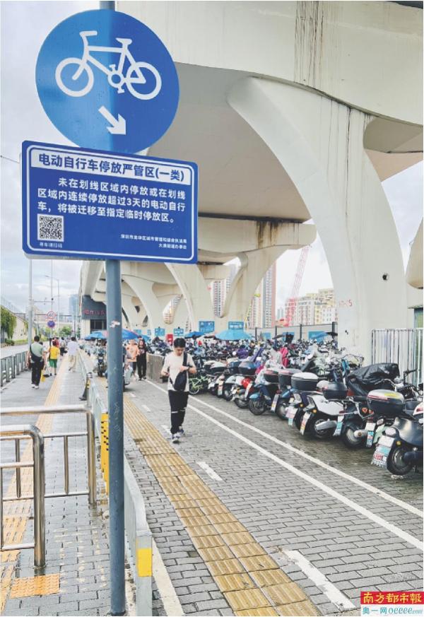 今年2月,南都奥一网“走好新时代网上群众路线大调研”栏目曾实地走访龙岗、龙华、宝安等区地铁站,发现电动自行车乱停放问题已演变为系统性顽疾。据了解,阳台山东站地铁口日均违停电动自行车数量最高时达1200多台,曾有市民调侃:“英雄难过阳台山东,过个马路像跳芭蕾。”这并非个例,在清湖地铁站D口,公交站禁停区被电动自行车占据,公交车无法正常进站,乘客不得不穿行“车阵”到马路中央上车。