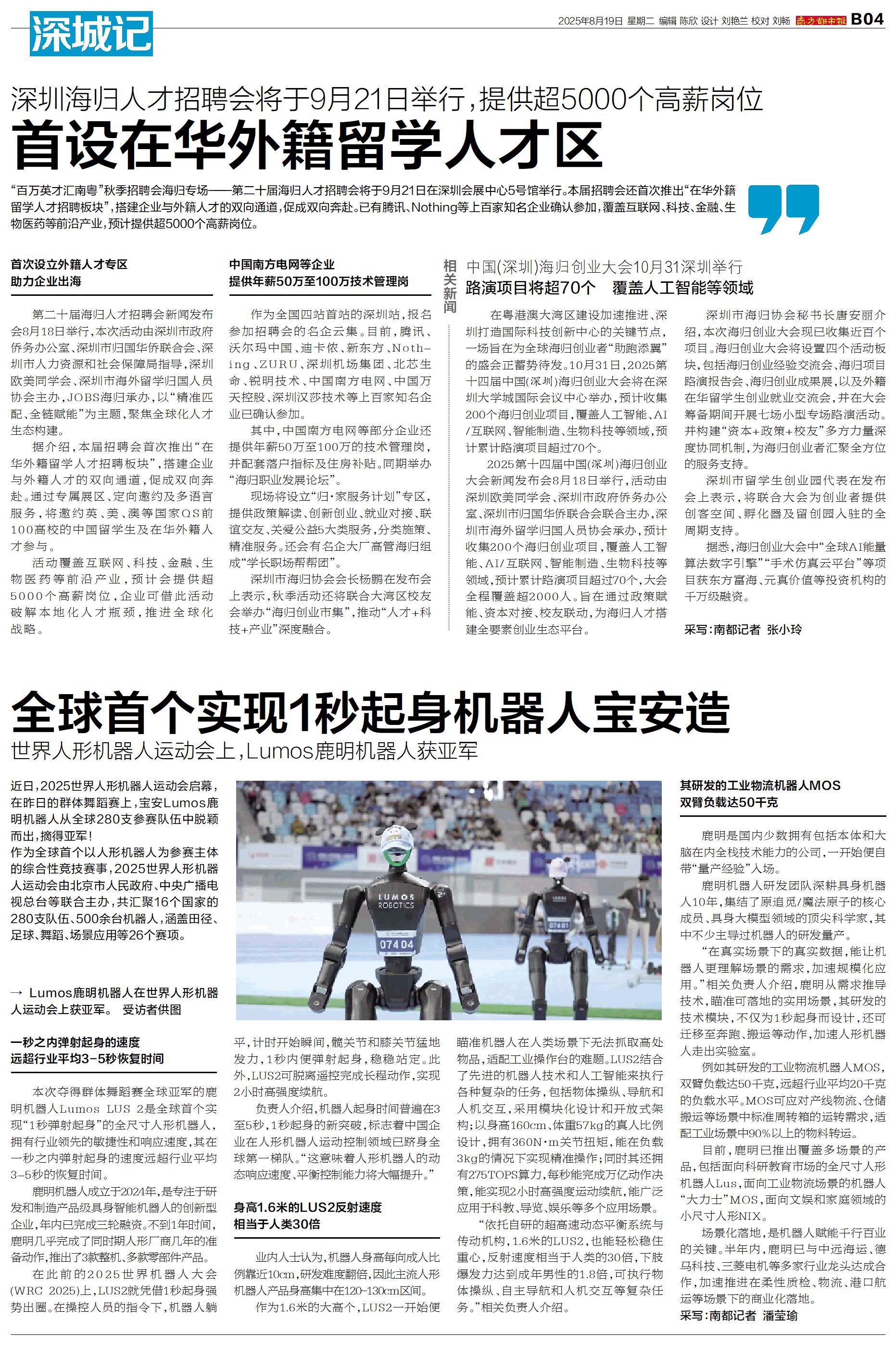 “百万英才汇南粤”秋季招聘会海归专场——第二十届海归人才招聘会将于9月21日在深圳会展中心5号馆举行。本届招聘会还首次推出“在华外籍留学人才招聘板块”,搭建企业与外籍人才的双向通道,促成双向奔赴。