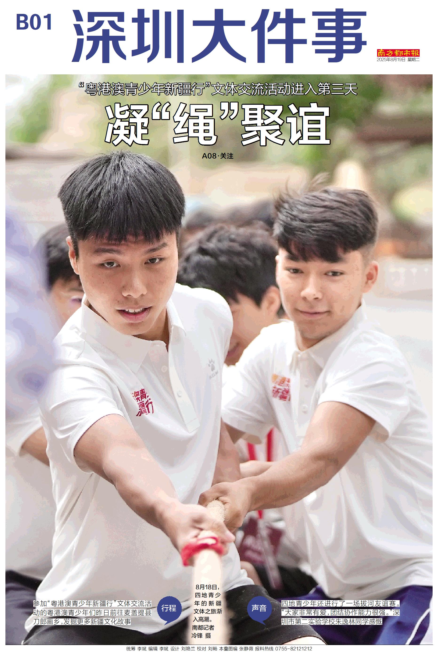 行程 参加“粤港澳青少年新疆行”文体交流活动的粤港澳青少年们昨日前往麦盖提县刀郎画乡,发掘更多新疆文化故事 声音 四地青少年还进行了一场拔河友谊赛。“大家非常有爱,团结协作能力很强。”深圳市