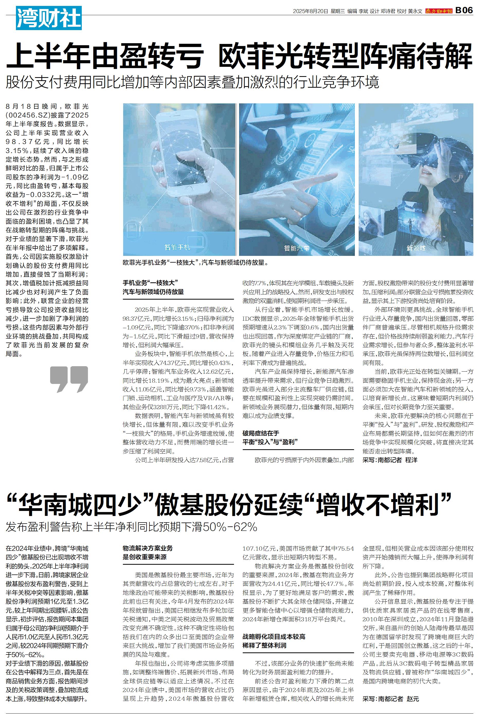 8月18日晚间,欧菲光(002456.SZ)披露了2025年上半年度报告。数据显示,公司上半年实现营业收入98.37亿元,同比增长3.15%,延续了收入端的稳定增长态势。然而,与之形成鲜明对比的是