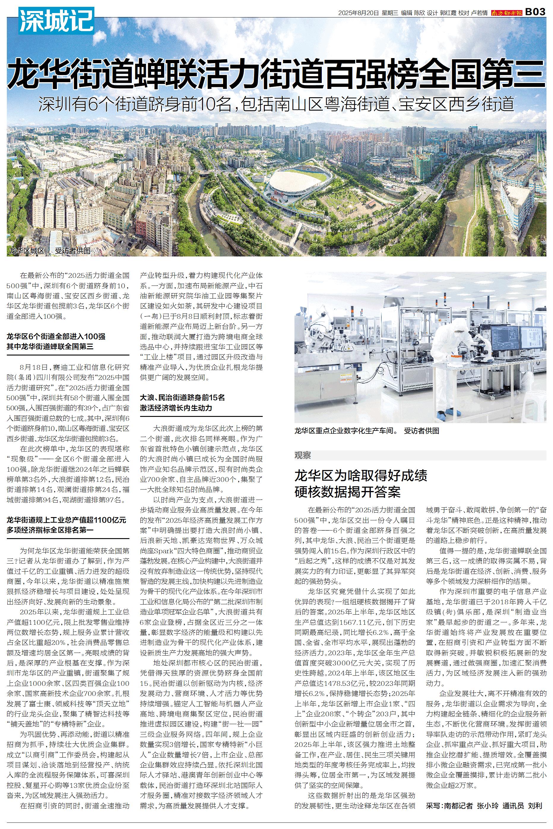 在最新公布的“2025活力街道全国500强”中,深圳有6个街道跻身前10,南山区粤海街道、宝安区西乡街道、龙华区龙华街道包揽前3名,龙华区6个街道全部进入100强。 龙华区6个街道全部进入1