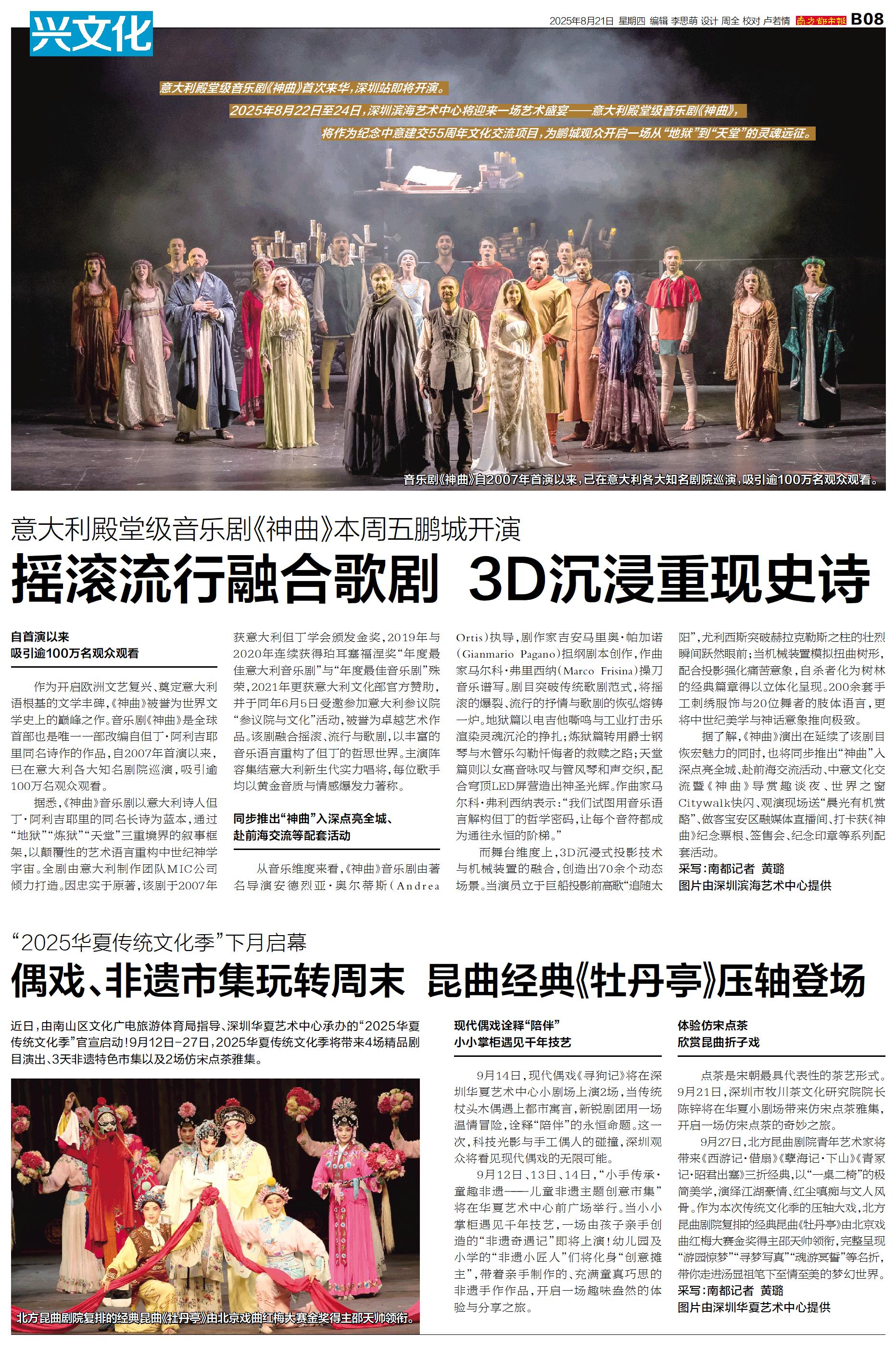 意大利殿堂级音乐剧《神曲》首次来华,深圳站即将开演。 2025年8月22日至24日,深圳滨海艺术中心将迎来一场艺术盛宴——意大利殿堂级音乐剧《神曲》,将作为纪念中意建交55周年文化交流项目,为鹏
