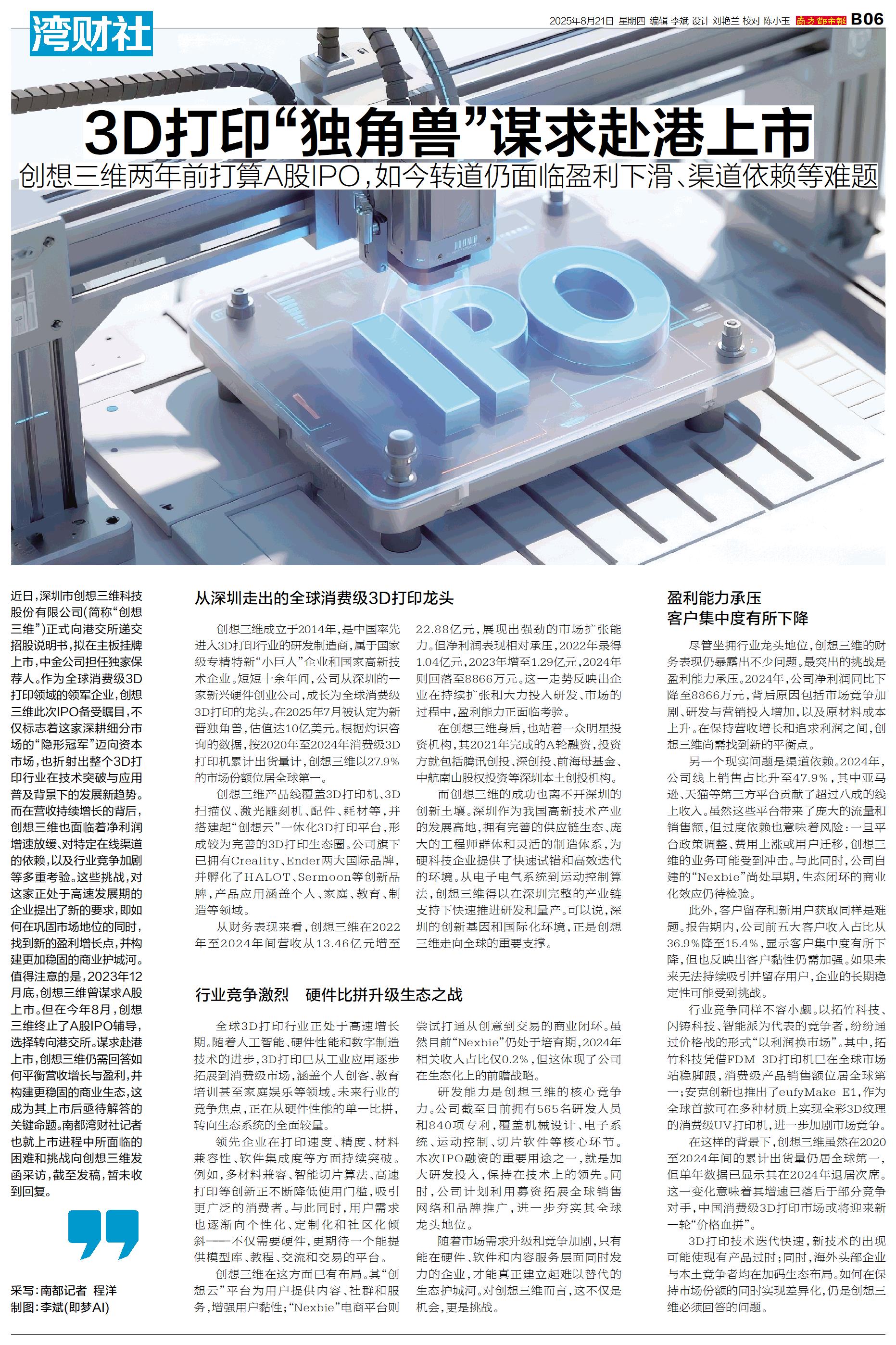近日,深圳市创想三维科技股份有限公司(简称“创想三维”)正式向港交所递交招股说明书,拟在主板挂牌上市,中金公司担任独家保荐人。作为全球消费级3D打印领域的领军企业,创想三维此次IPO备受瞩目,不仅