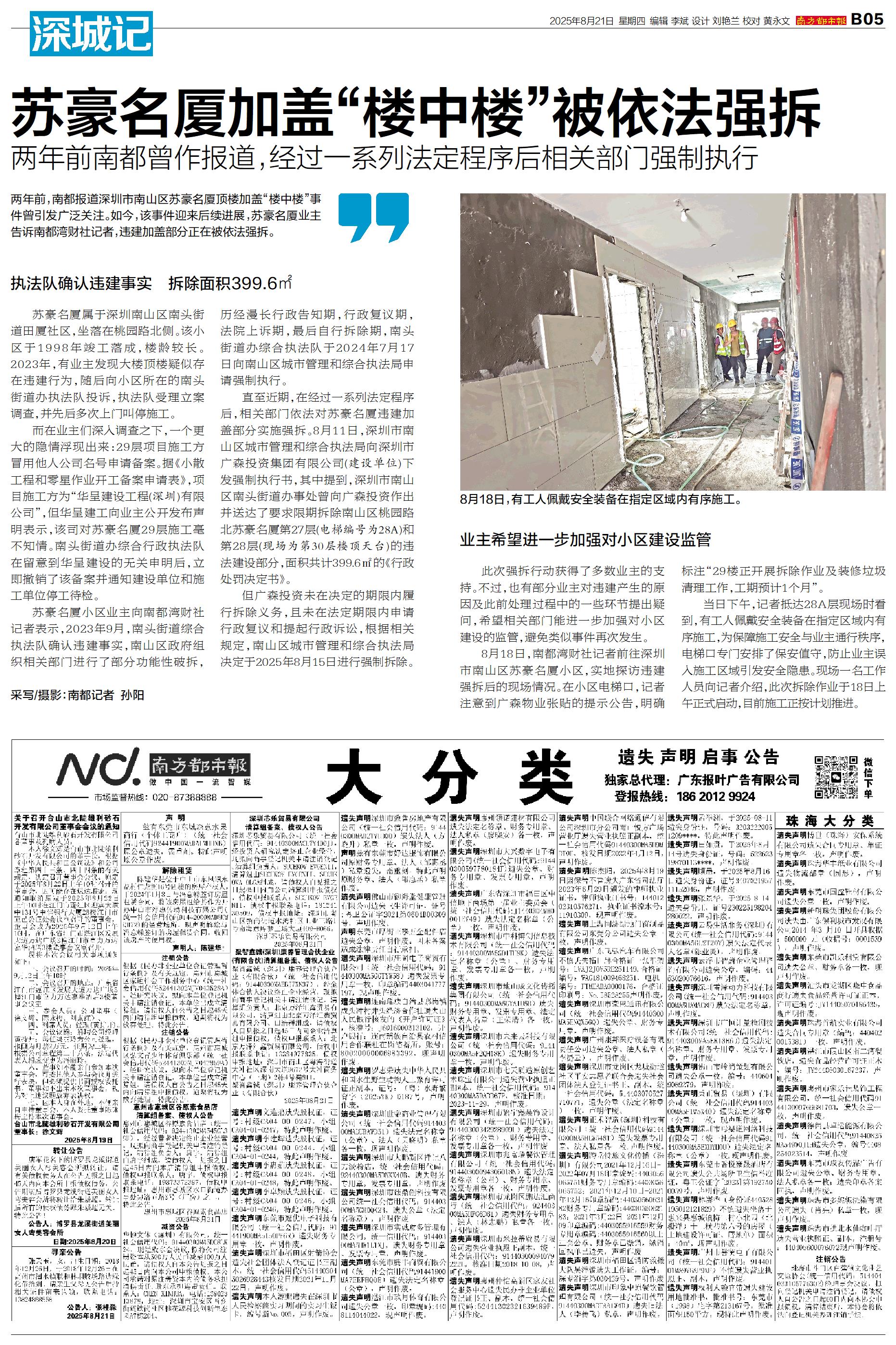 两年前,南都报道深圳市南山区苏豪名厦顶楼加盖“楼中楼”事件曾引发广泛关注。如今,该事件迎来后续进展,苏豪名厦业主告诉南都湾财社记者,违建加盖部分正在被依法强拆。 执法队确认违建事实 拆除面积39