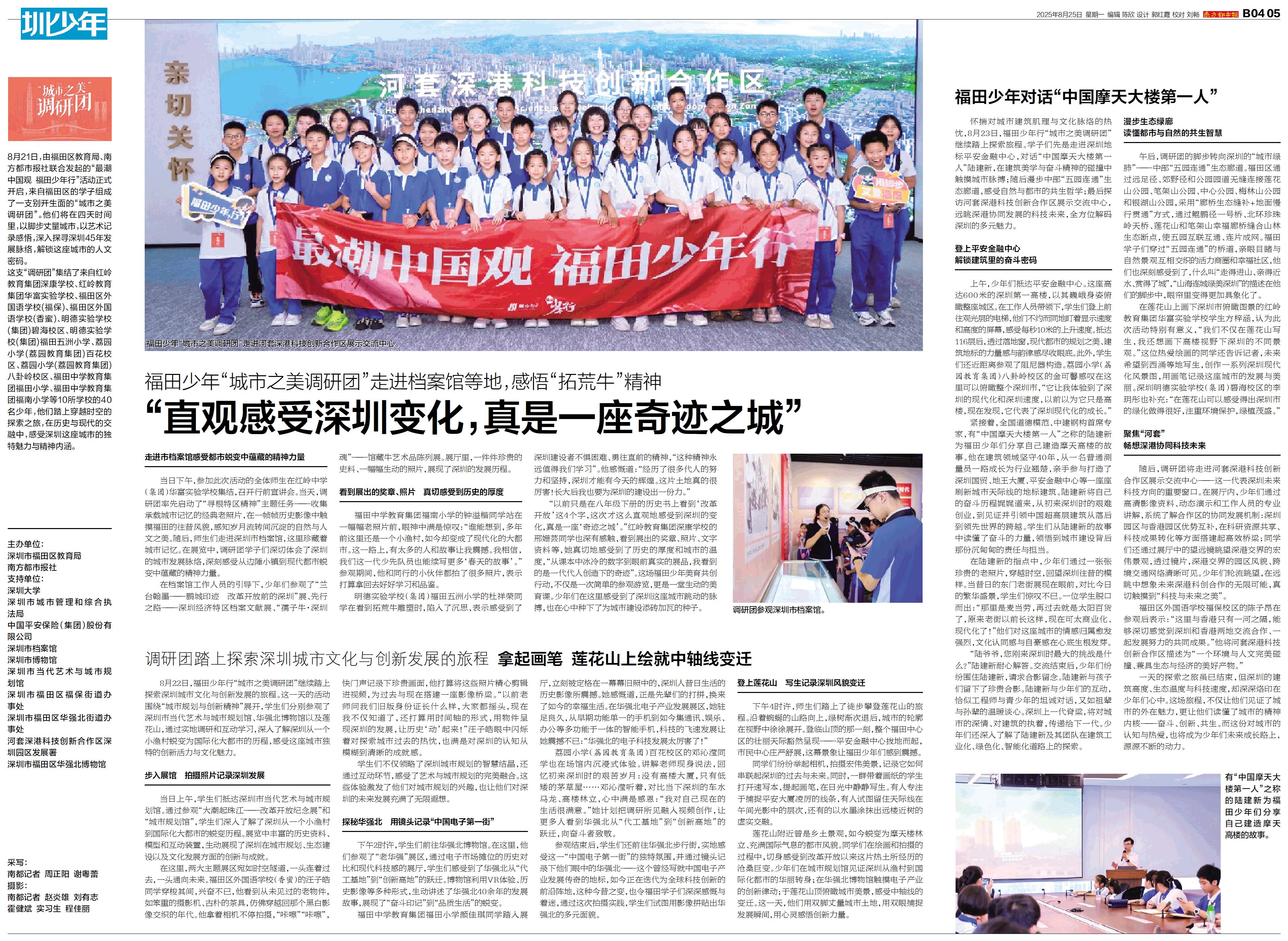 8月21日,由福田区教育局、南方都市报社联合发起的“最潮中国观 福田少年行”活动正式开启,来自福田区的学子组成了一支别开生面的“城市之美调研团”。他们将在四天时间里,以脚步丈量城市,以艺术记录感悟