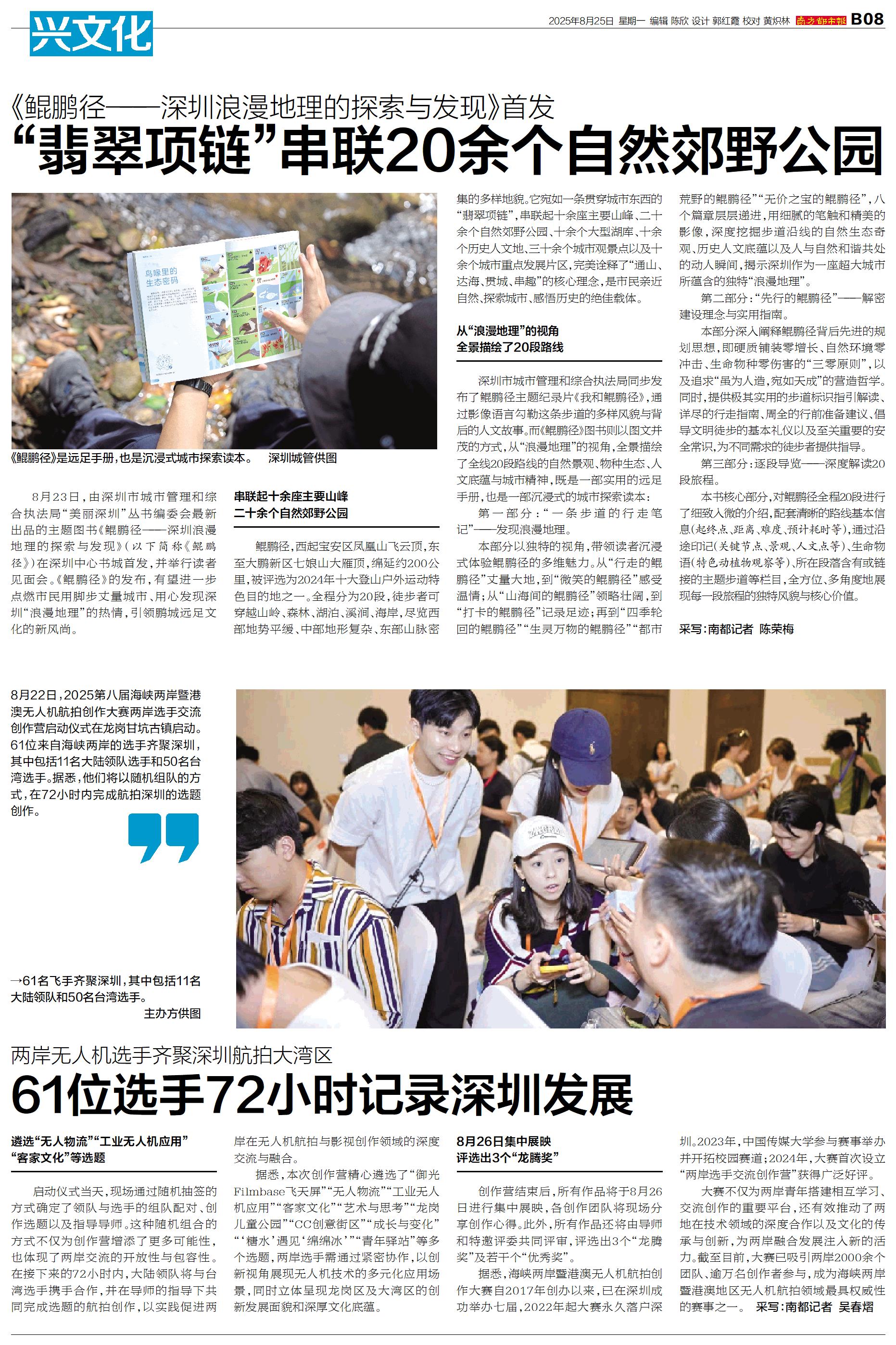 8月23日,由深圳市城市管理和综合执法局“美丽深圳”丛书编委会最新出品的主题图书《鲲鹏径——深圳浪漫地理的探索与发现》(以下简称《鲲鹏径》)在深圳中心书城首发,并举行读者见面会。《鲲鹏径》的发布,