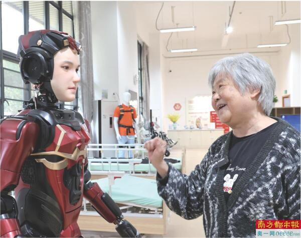 2025年3月3日,在深圳市养老护理院,一名老人与人形机器人互动。