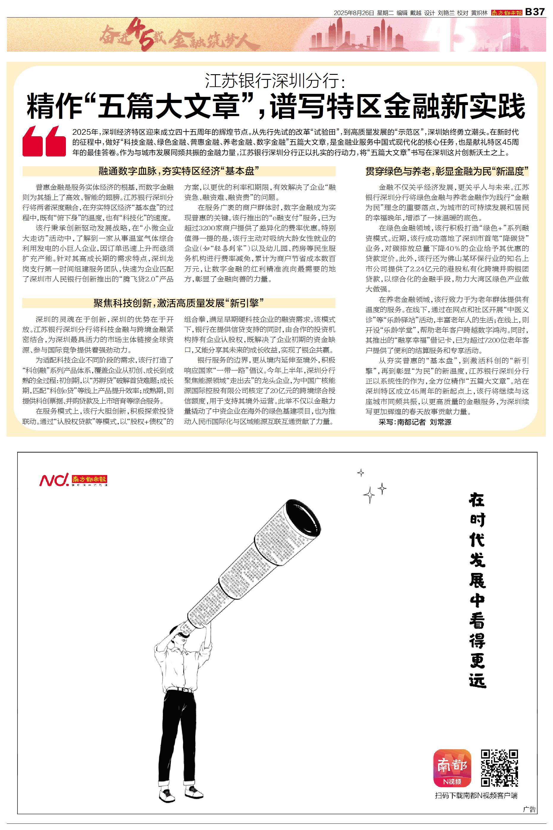 从夯实普惠的“基本盘”,到激活科创的“新引擎”,再到彰显“为民”的新温度,江苏银行深圳分行正以系统性的作为,全方位精作“五篇大文章”。站在深圳特区成立45周年的新起点上,该行将继续与这座城市同频共振,以更高质量的金融服务,为深圳续写更加辉煌的春天故事贡献力量。