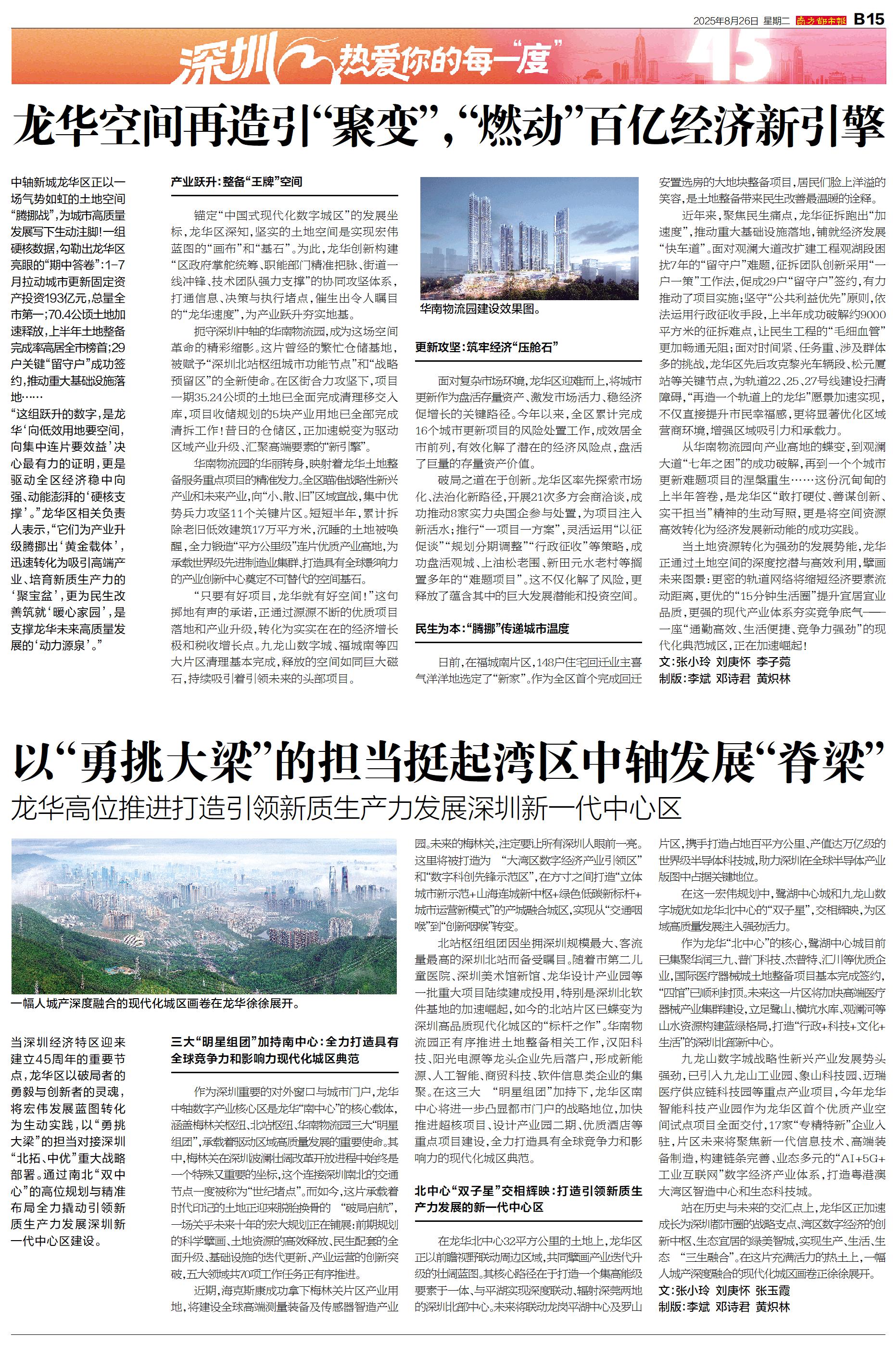 当深圳经济特区迎来建立45周年的重要节点,龙华区以破局者的勇毅与创新者的灵魂,将宏伟发展蓝图转化为生动实践,以“勇挑大梁”的担当对接深圳“北拓、中优”重大战略部署。通过南北“双中心”的高位规划与精
