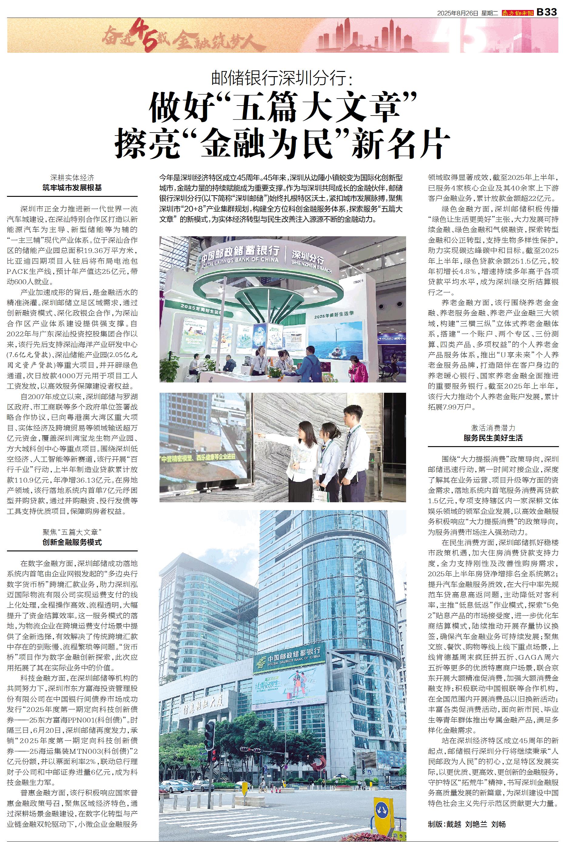 今年是深圳经济特区成立45周年。45年来,深圳从边陲小镇蜕变为国际化创新型城市,金融力量的持续赋能成为重要支撑。作为与深圳共同成长的金融伙伴,邮储银行深圳分行(以下简称“深圳邮储”)始终扎根特区沃