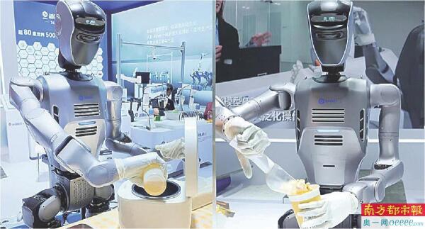 世界机器人大会越疆机器人展台,速腾聚创Airy加持的具身智能人形机器人制作柠檬茶。