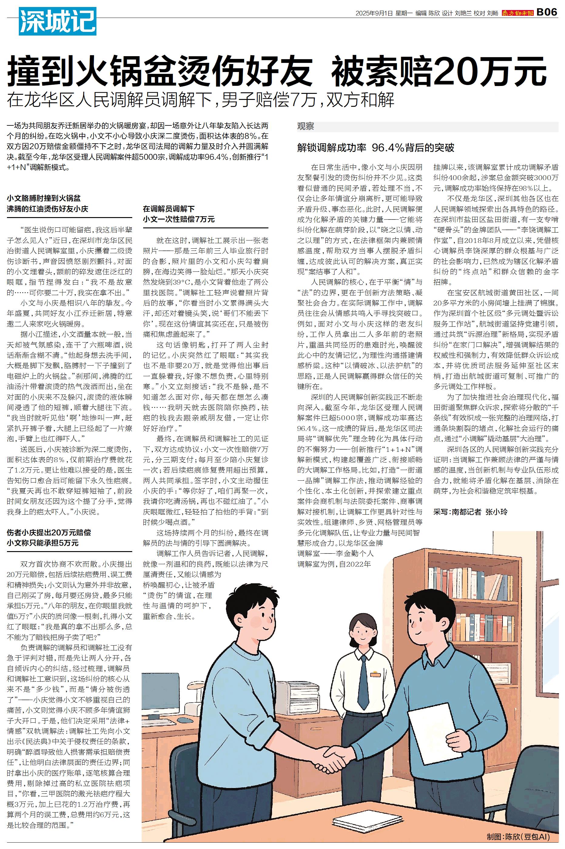一场为共同朋友乔迁新居举办的火锅暖房宴,却因一场意外让八年挚友陷入长达两个月的纠纷。在吃火锅中,小文不小心导致小庆深二度烫伤,面积达体表的8%。在双方因20万赔偿金额僵持不下之时,龙华区司法局的调