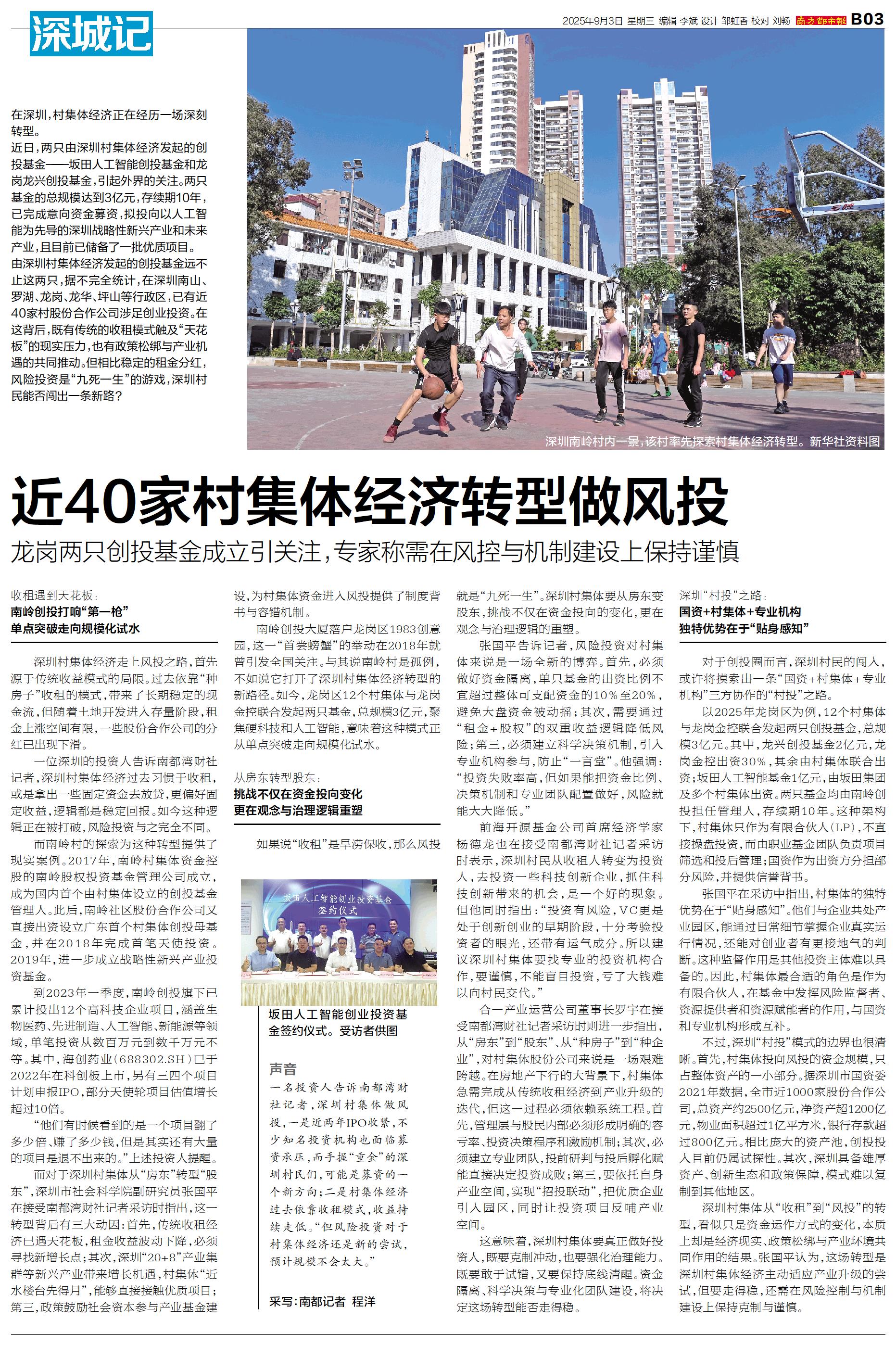 在深圳,村集体经济正在经历一场深刻转型。 近日,两只由深圳村集体经济发起的创投基金——坂田人工智能创投基金和龙岗龙兴创投基金,引起外界的关注。两只基金的总规模达到3亿元,存续期10年,已完成意向