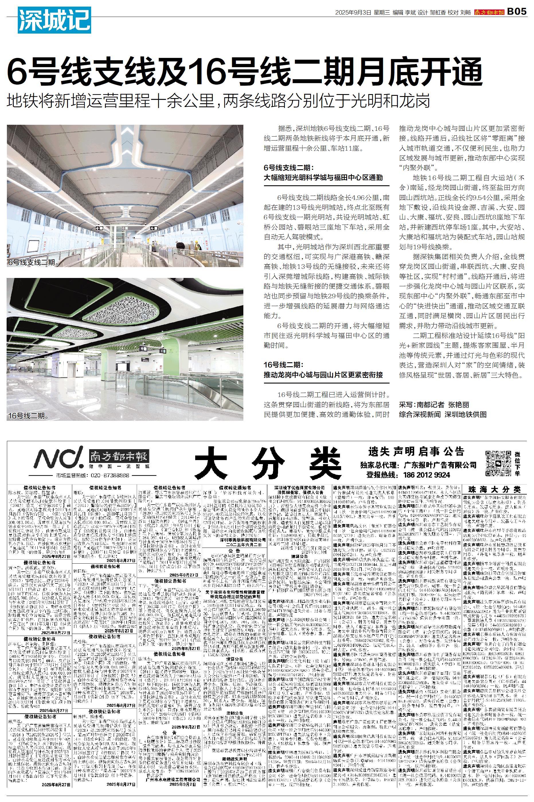 据悉,深圳地铁6号线支线二期、16号线二期两条地铁新线将于本月底开通,新增运营里程十余公里、车站11座。 6号线支线二期: 大幅缩短光明科学城与福田中心区通勤 6号线支线二期线路全长