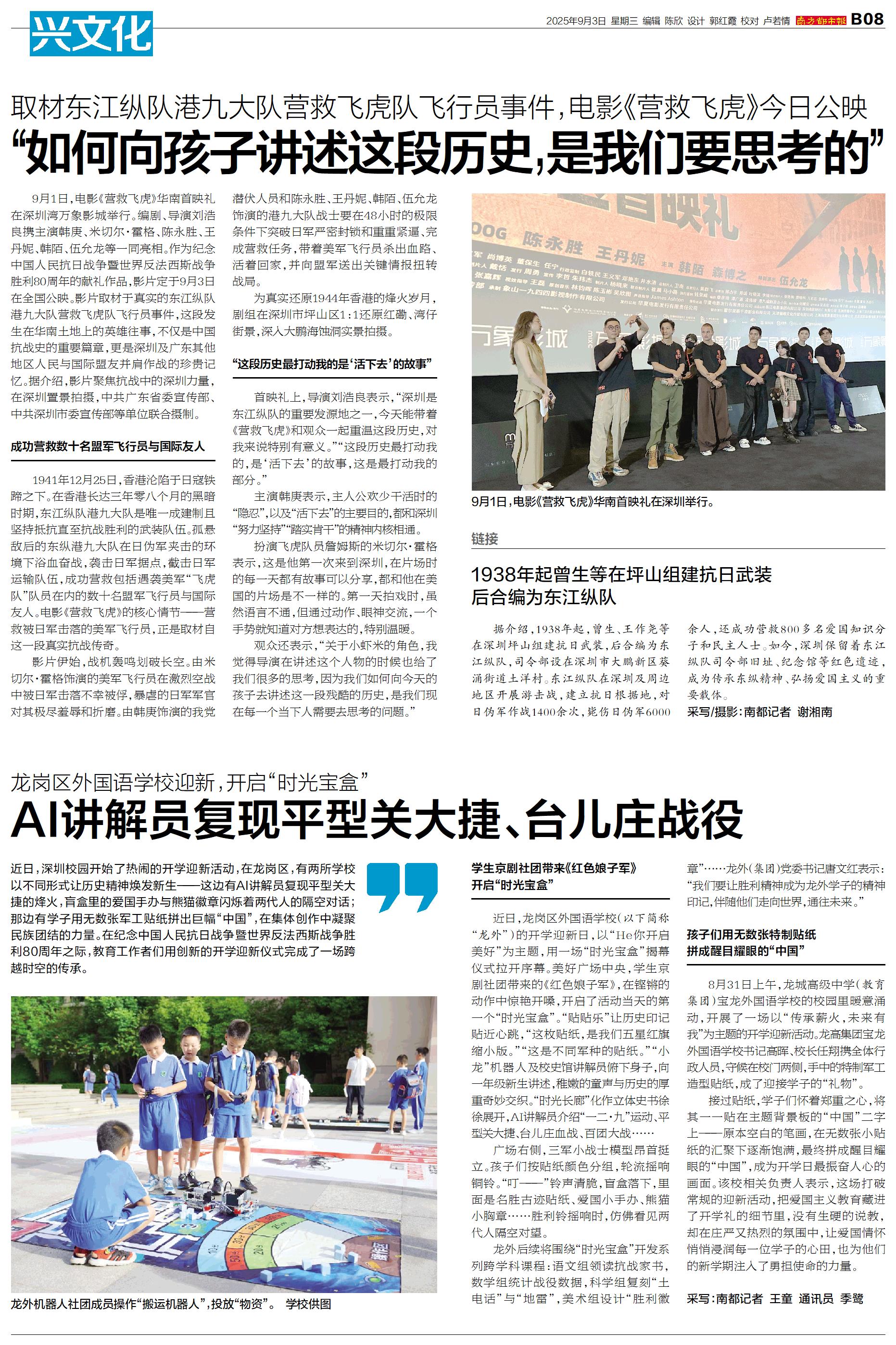 9月1日,电影《营救飞虎》华南首映礼在深圳湾万象影城举行。编剧、导演刘浩良携主演韩庚、米切尔·霍格、陈永胜、王丹妮、韩陌、伍允龙等一同亮相。作为纪念中国人民抗日战争暨世界反法西斯战争胜利80周年的