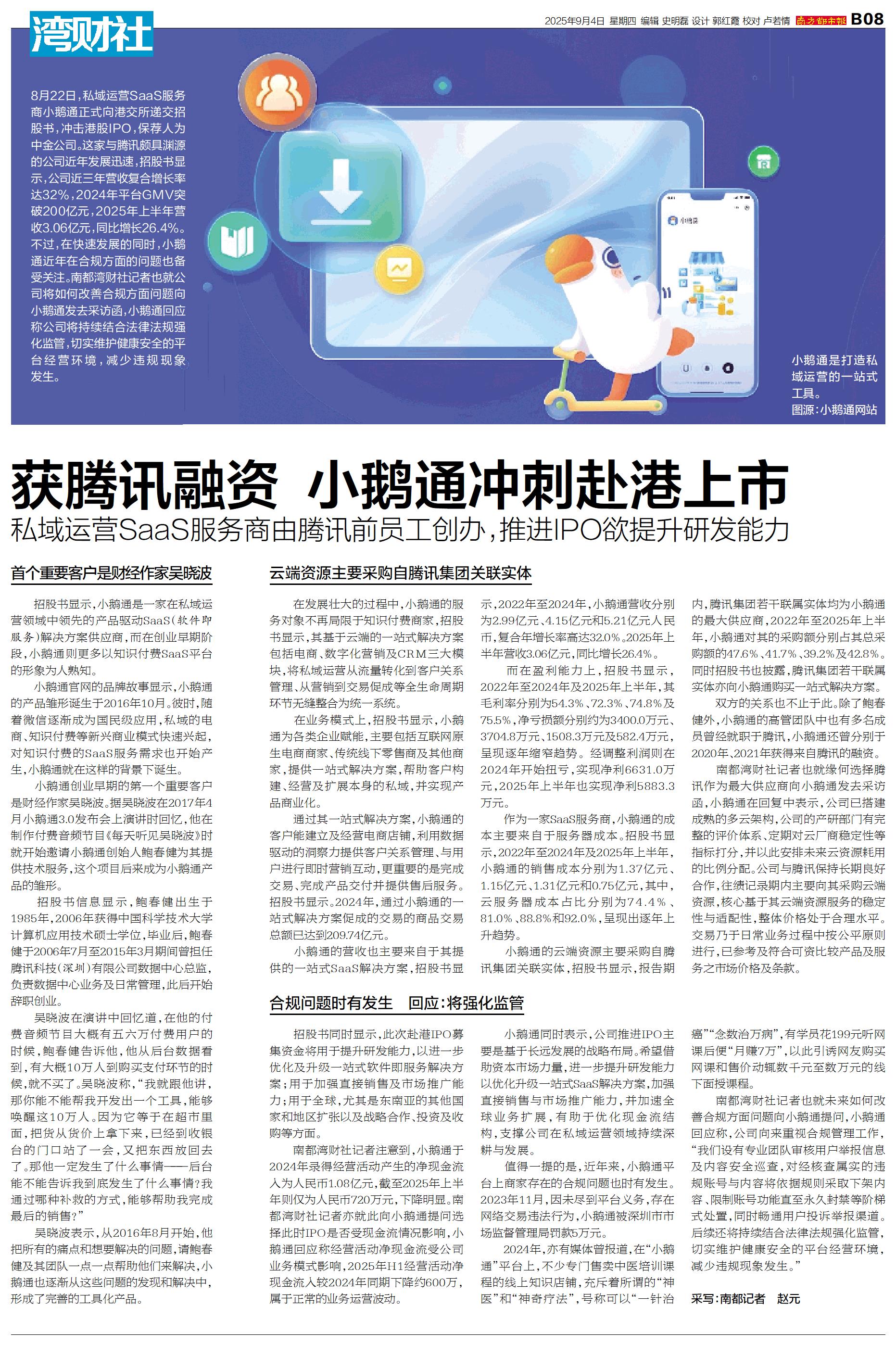 8月22日,私域运营SaaS服务商小鹅通正式向港交所递交招股书,冲击港股IPO,保荐人为中金公司。这家与腾讯颇具渊源的公司近年发展迅速,招股书显示,公司近三年营收复合增长率达32%,2024年平台