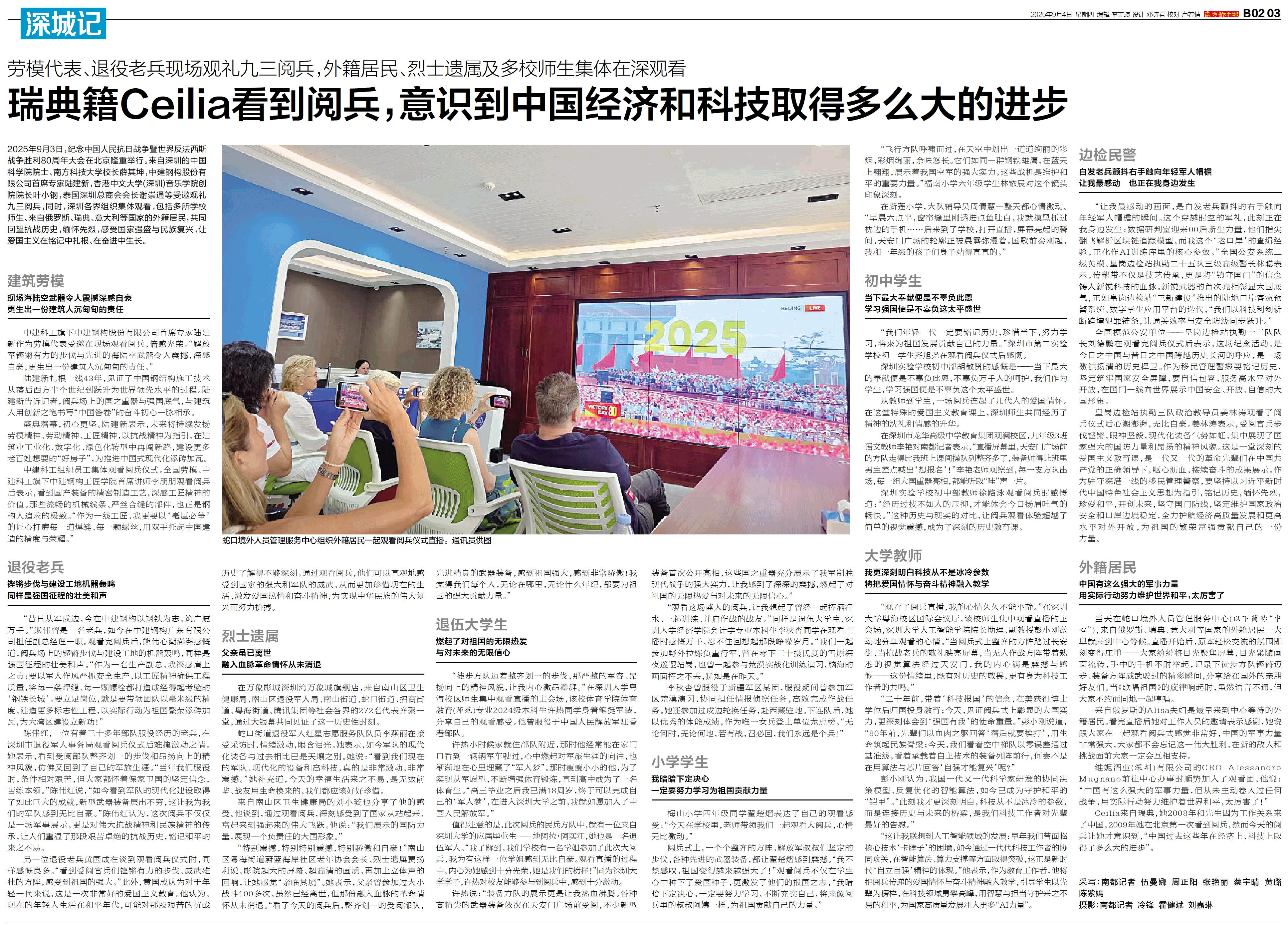 2025年9月3日,纪念中国人民抗日战争暨世界反法西斯战争胜利80周年大会在北京隆重举行。来自深圳的中国科学院院士、南方科技大学校长薛其坤,中建钢构股份有限公司首席专家陆建新,香港中文大学(深圳)