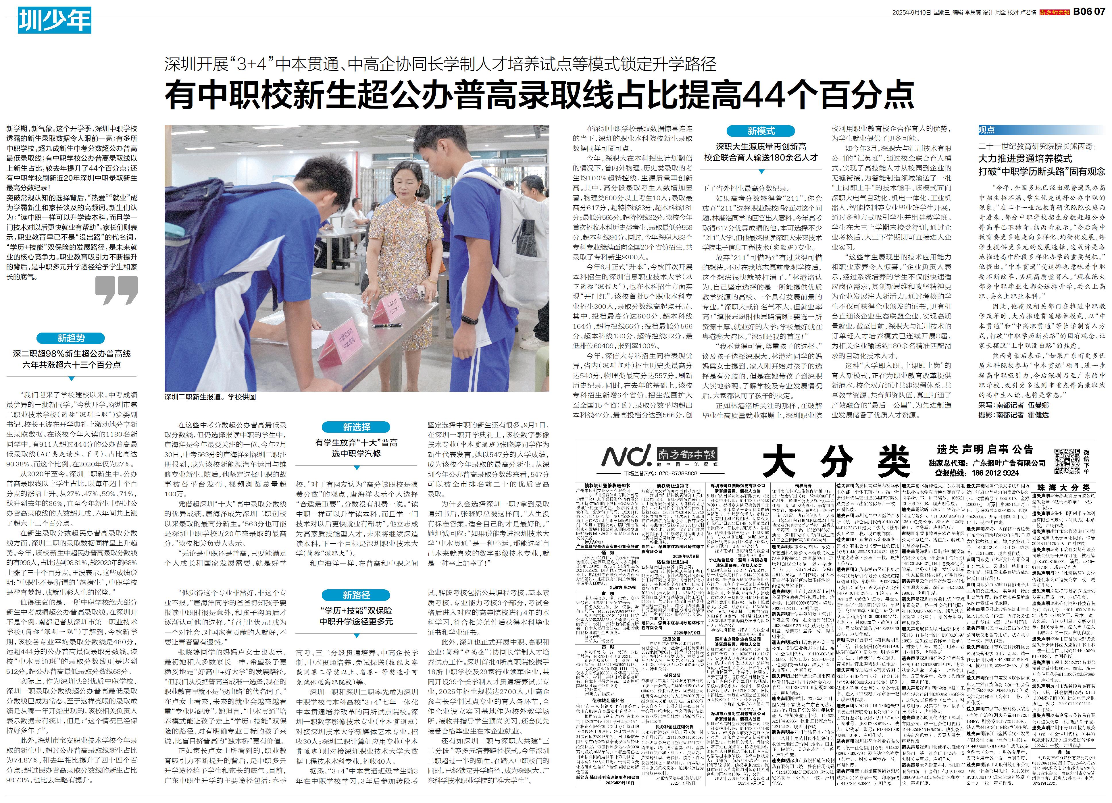 新学期,新气象。这个开学季,深圳中职学校透露的新生录取数据令人眼前一亮:有多所中职学校,超九成新生中考分数超公办普高最低录取线;有中职学校公办普高录取线以上新生占比,较去年提升了44个百分点;还有中职学校刷新近20年深圳中职录取新生最高分数纪录!