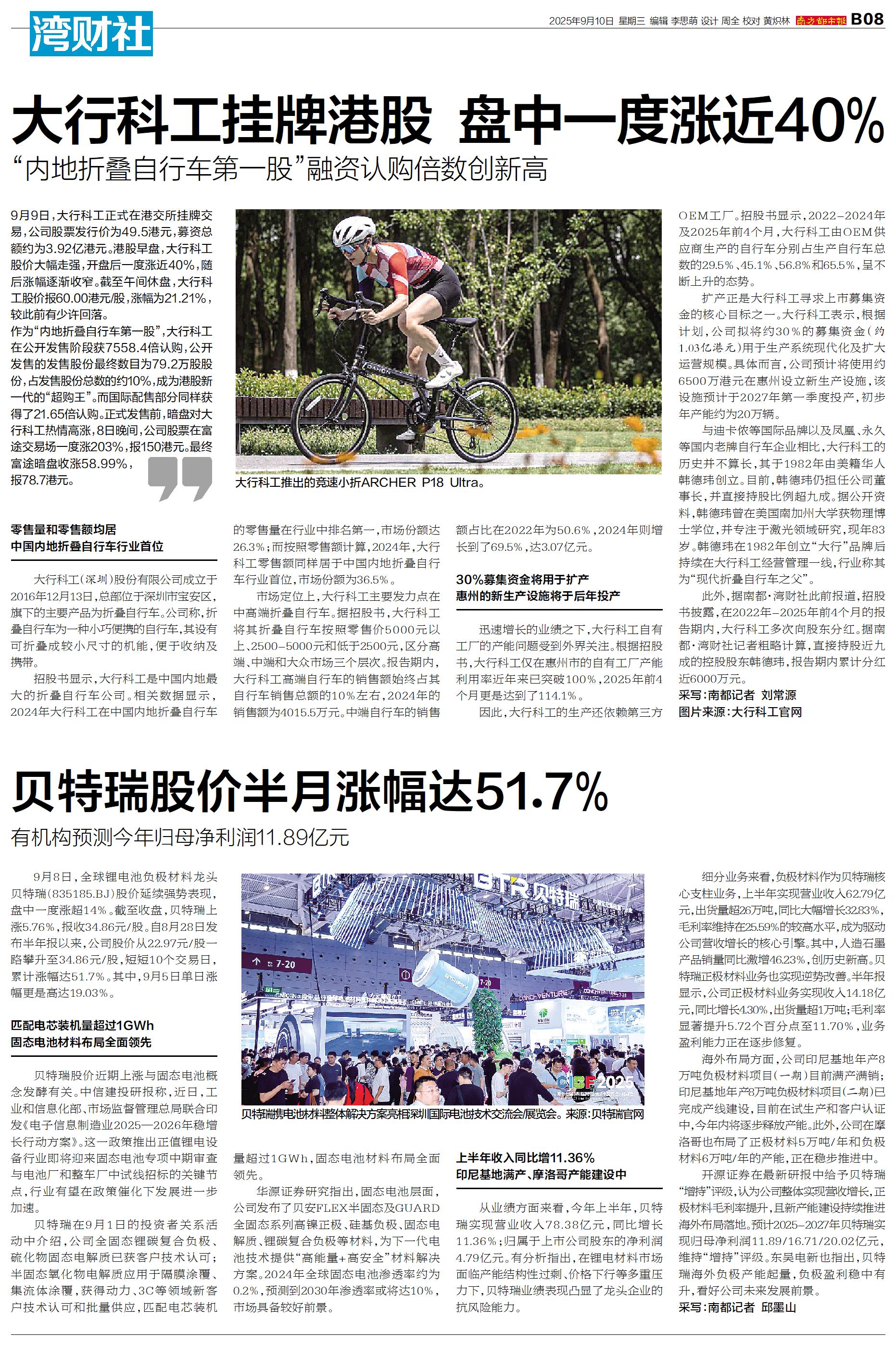 9月9日,大行科工正式在港交所挂牌交易,公司股票发行价为49.5港元,募资总额约为3.92亿港元。港股早盘,大行科工股价大幅走强,开盘后一度涨近40%,随后涨幅逐渐收窄。截至午间休盘,大行科工股价