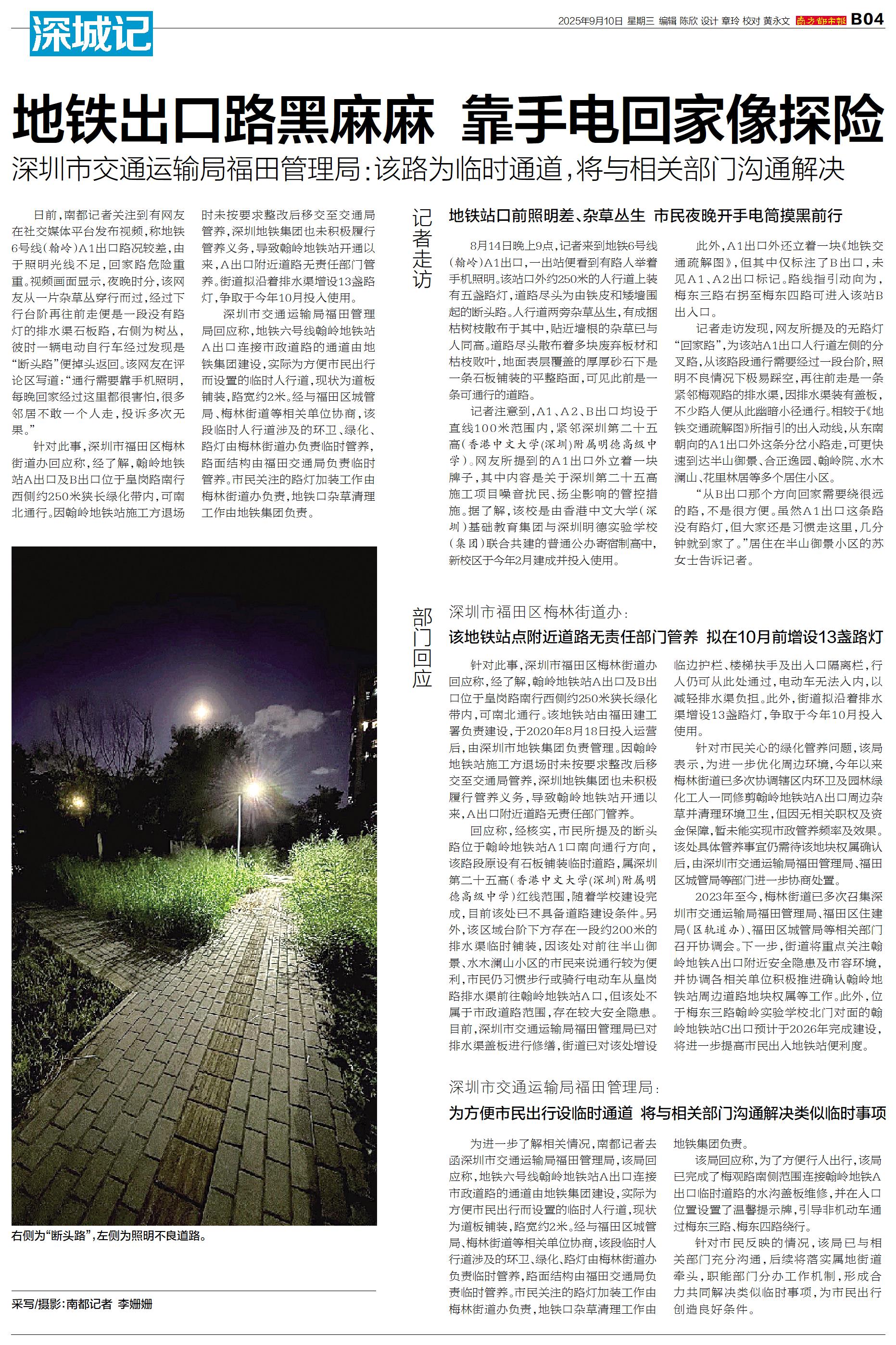 日前,南都记者关注到有网友在社交媒体平台发布视频,称地铁6号线(翰岭)A1出口路况较差,由于照明光线不足,回家路危险重重。视频画面显示,夜晚时分,该网友从一片杂草丛穿行而过,经过下行台阶再往前走便