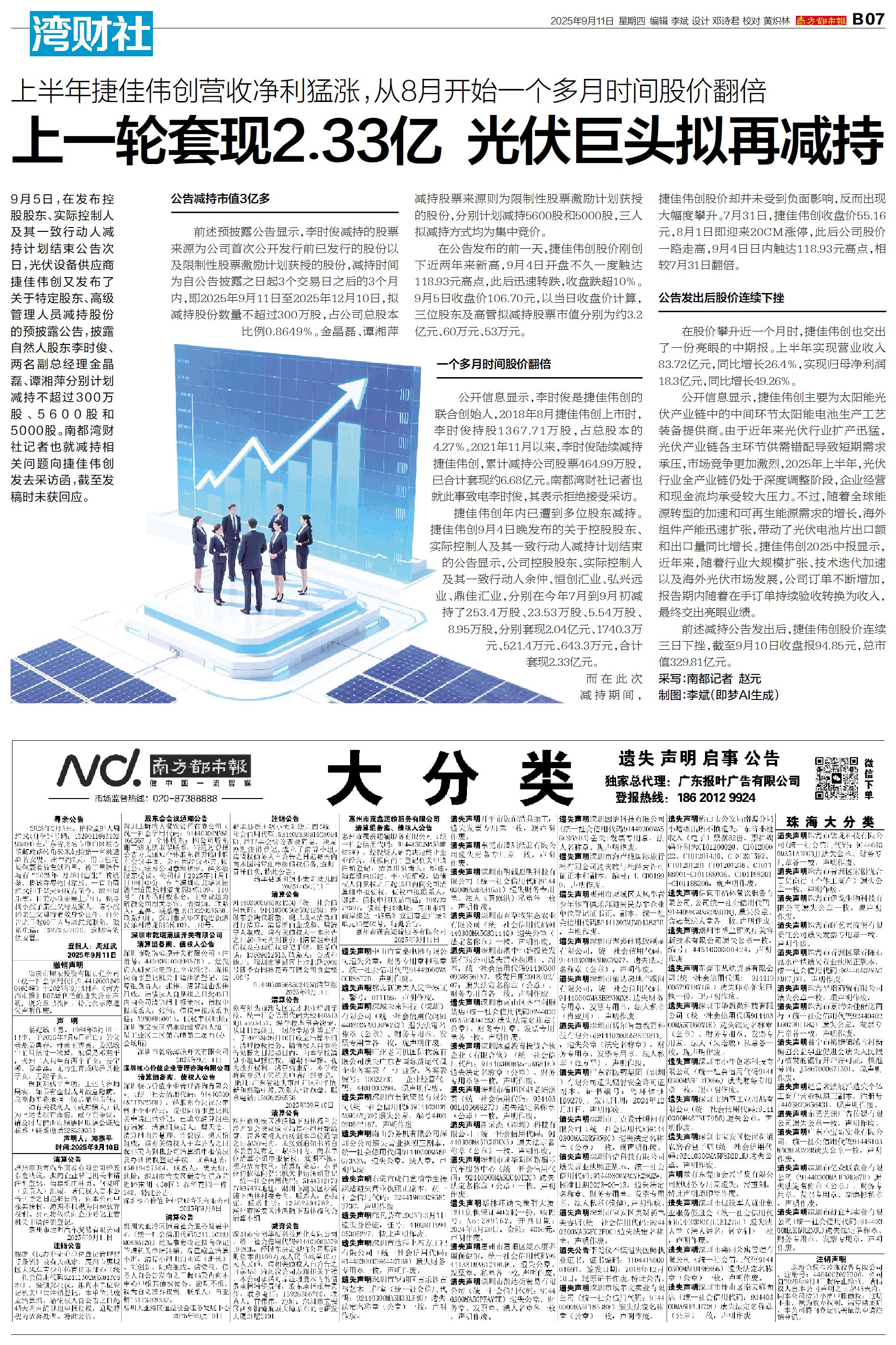 9月5日,在发布控股股东、实际控制人及其一致行动人减持计划结束公告次日,光伏设备供应商捷佳伟创又发布了关于特定股东、高级管理人员减持股份的预披露公告,披露自然人股东李时俊、两名副总经理金晶磊、谭湘